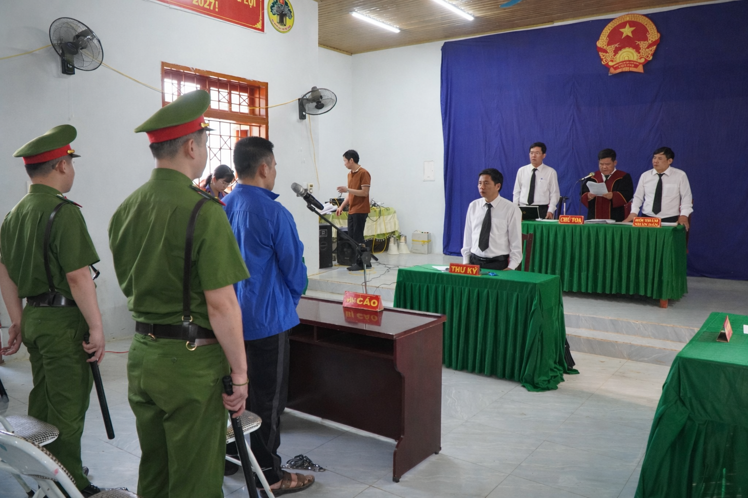 Quang cảnh phiên tòa xét xử lưu động 2 vụ án ma túy tại Nhà văn hóa bản Huổi Nhả, xã Phiêng Cằm, tỉnh Sơn La.