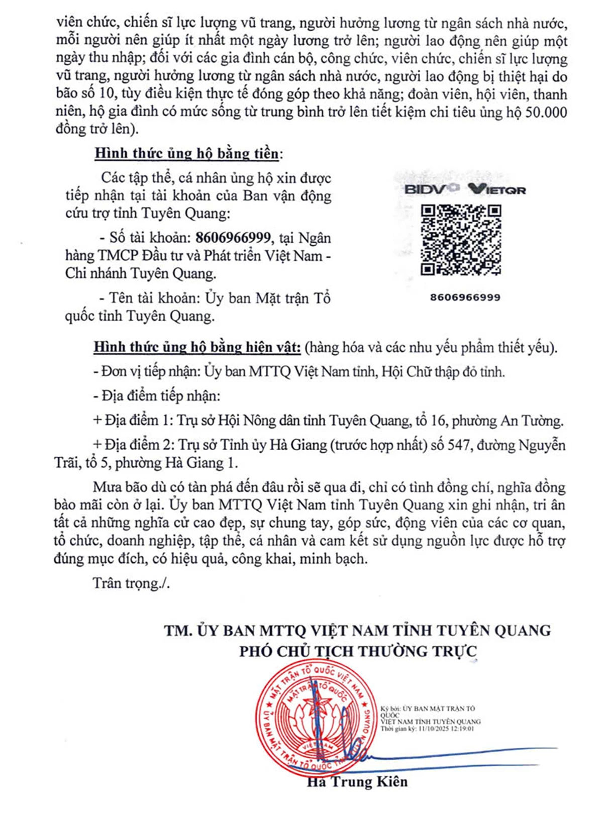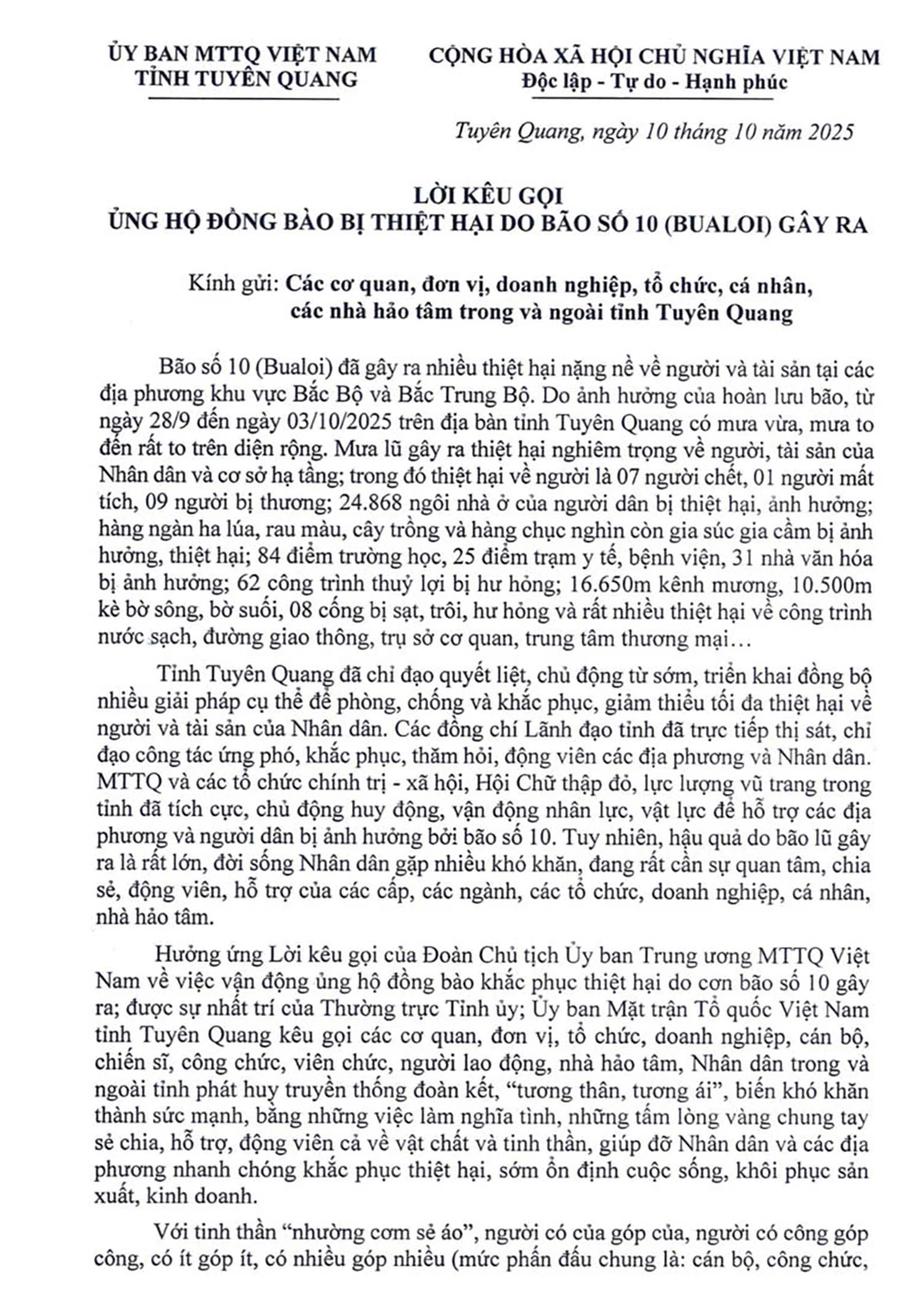 Ủy ban MTTQ Việt Nam tỉnh Tuyên Quang ra lời kêu gọi các tổ chức, cá nhân và nhà hảo tâm trong cả nước chung tay phát huy tinh thần "tương thân tương ái" ủng hộ đồng bào vùng lũ khắc phục hậu quả, sớm ổn định cuộc sống và sản xuất.