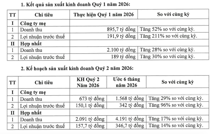Bên cạnh đó, Hội đồng quản trị công ty đồng thời công bố kế hoạch kinh doanh quý II/2026 với doanh thu hợp nhất 2.091 tỷ đồng và lợi nhuận trước thuế 157,7 tỷ đồng.