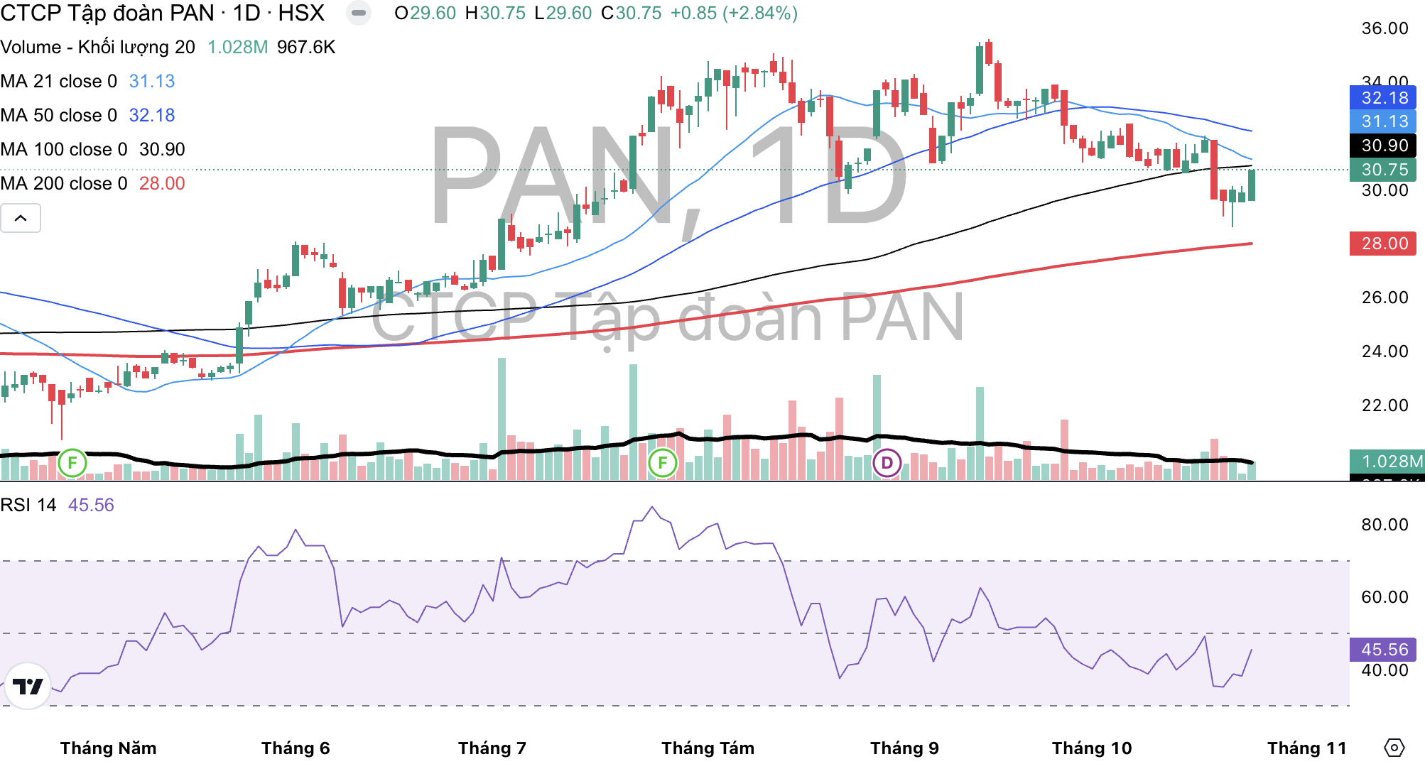 Đóng cửa phiên giao dịch ngày 24/10, cổ phiếu PAN tăng 850 đồng lên 30.750 đồng/cổ phiếu.