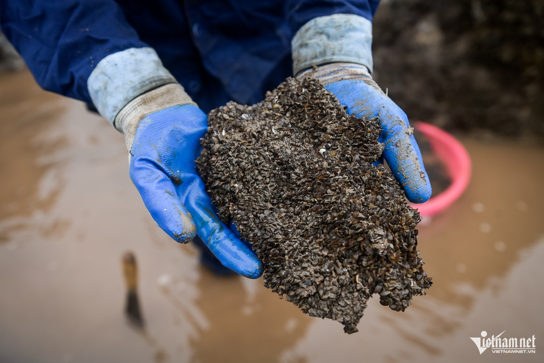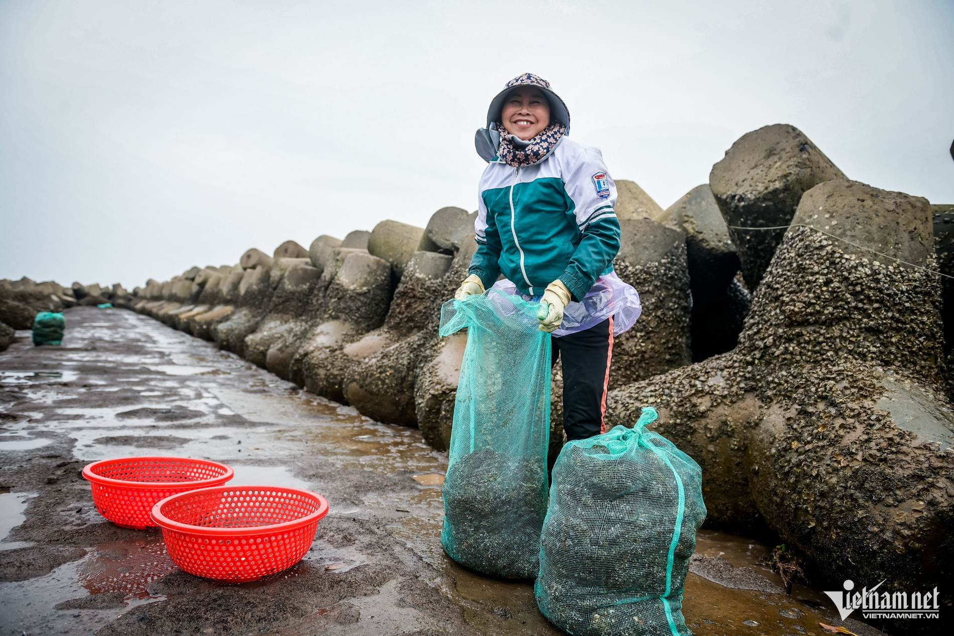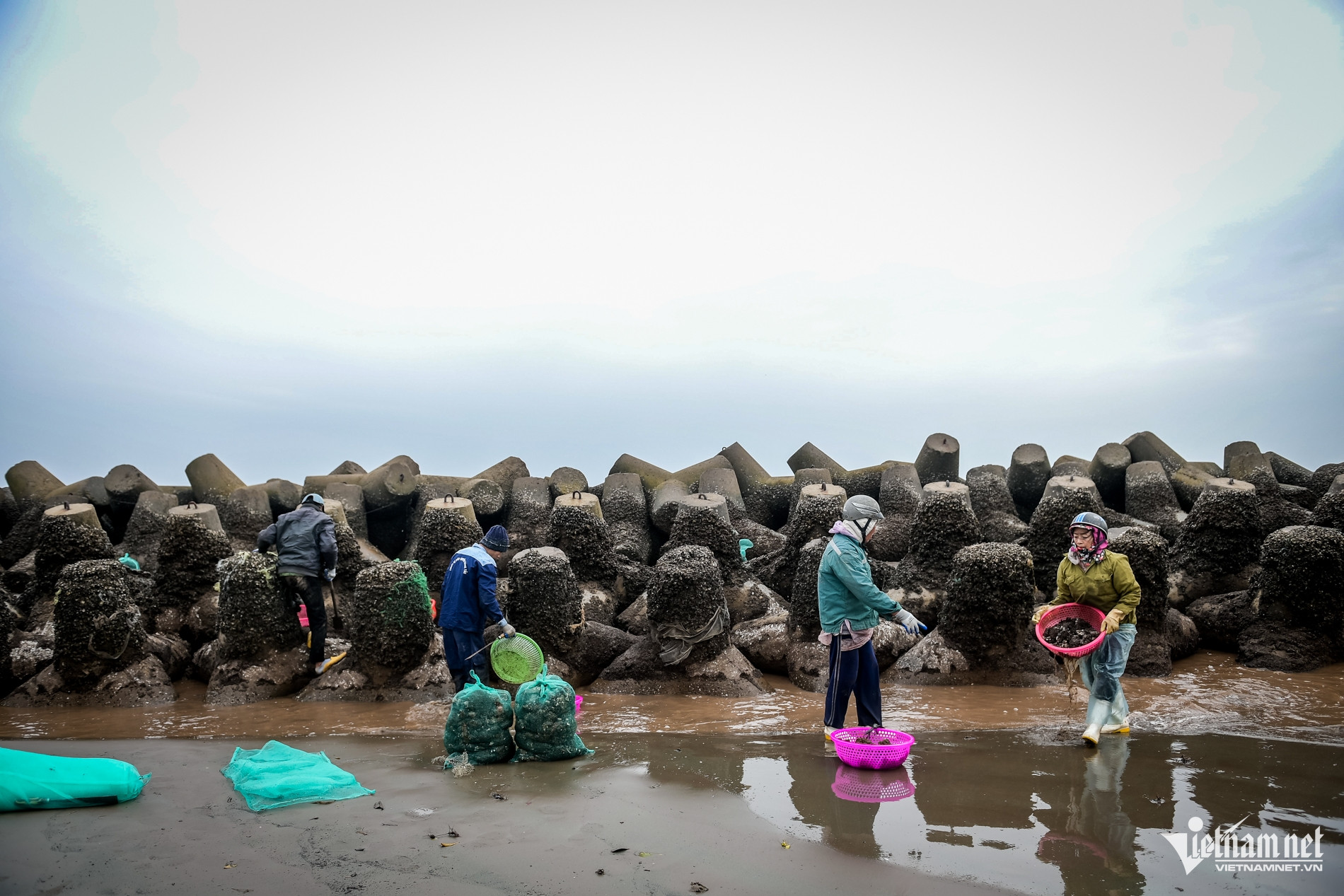 Trên bãi triều mênh mông, gió biển thổi buốt mặt, nước biển mùa đông lạnh ngắt khiến mũi ai nấy đều đỏ hoe, đôi chân tê dại. Để tránh gió lạnh, nhiều người khoác thêm áo mưa mỏng, quấn vội chiếc khăn cũ, cúi gập người, tay thoăn thoắt cạy từng mảng vẹm bám chặt trên các khối bê tông.