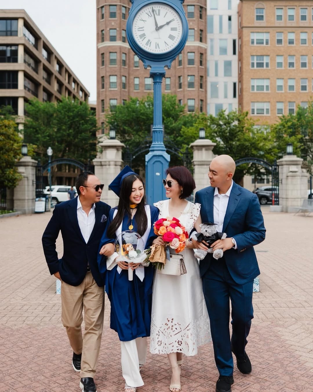 Về học vấn, tiểu thư của gia tộc Sơn Kim tốt nghiệp đại học tại Đại học Boston (Mỹ) tháng 5/2023, rồi hoàn thành chương trình thạc sĩ ở Đại học George Washington (Mỹ) sau đó 2 năm. Gia đình cũng bay sang Mỹ, tham dự lễ tốt nghiệp thạc sĩ của Ruby Nguyễn vào năm 2025. “Bất ngờ thay, tôi nhận ra mình đã tiến xa đến thế nào. Chương này khép lại với niềm vinh dự lớn lao. Nó bắt đầu từ những câu chuyện của bà ngoại, sự hy sinh của bố mẹ và tình yêu thương của bạn bè. Tôi hy vọng điều này sẽ làm bố mẹ tự hào”, cô chia sẻ đầy xúc động trên trang cá nhân.