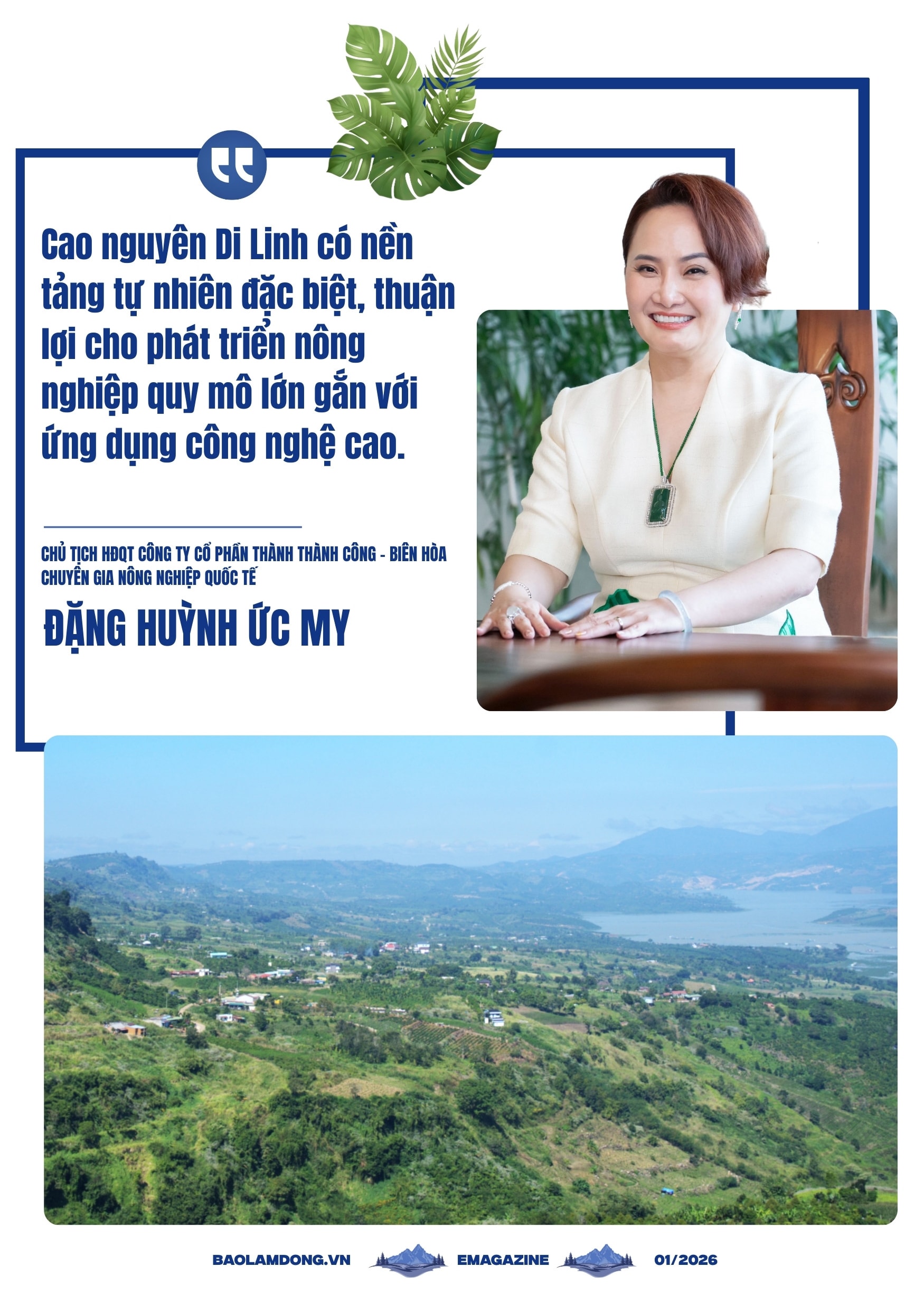 Bà Đặng Huỳnh Ức My, chuyên gia quốc tế về nông nghiệp cho rằng, Cao nguyên Di Linh có nền tảng tự nhiên đặc biệt, thuận lợi cho phát triển nông nghiệp quy mô lớn gắn với ứng dụng công nghệ cao.