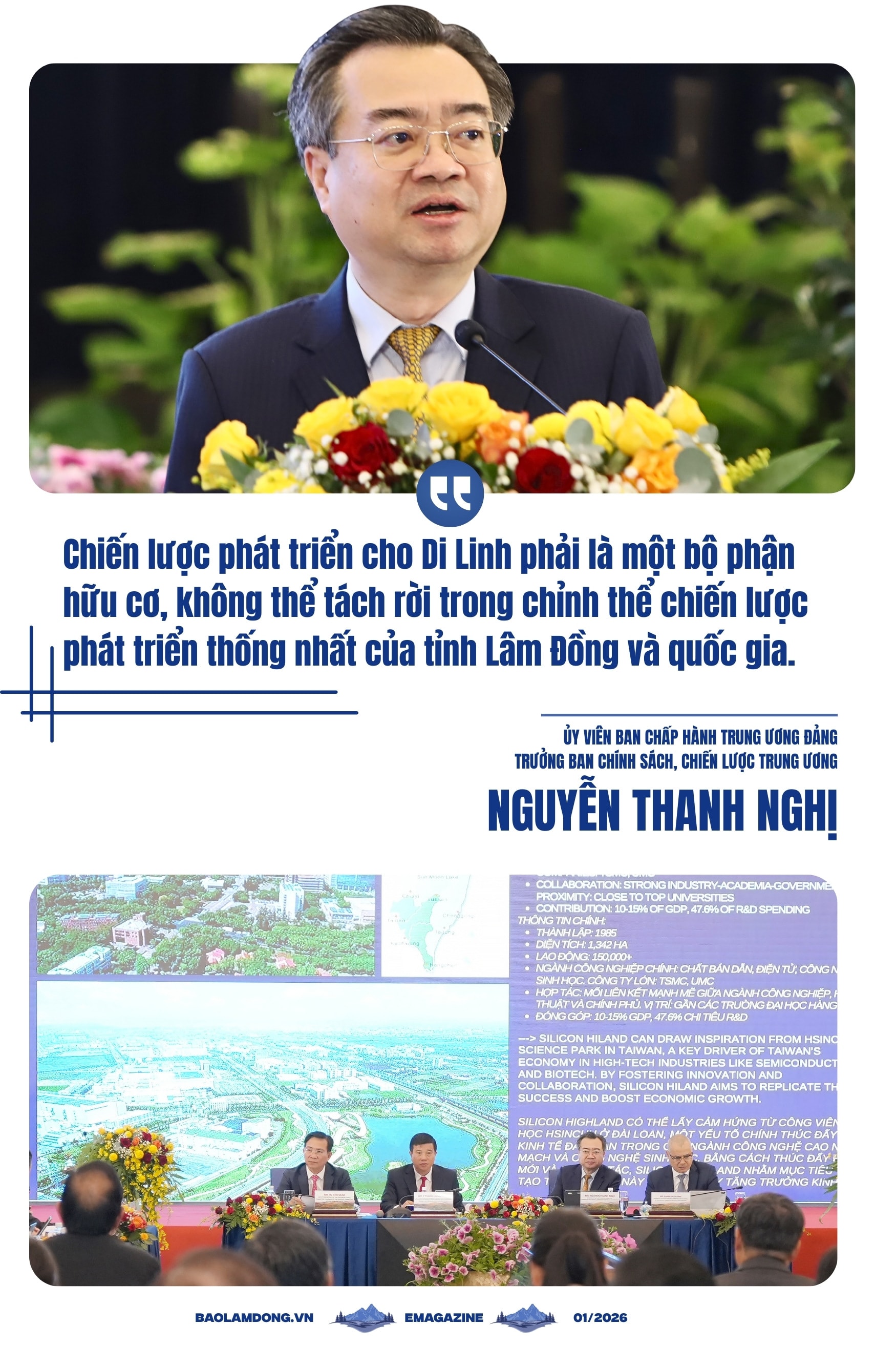 Chia sẻ về tiềm năng của Cao nguyên Di Linh, Ủy viên Ban Chấp hành Trung ương Đảng, Trưởng Ban Chính sách, Chiến lược Trung ương Nguyễn Thanh Nghị khẳng định: Tiềm năng của Di Linh là rất lớn, nhưng để biến tiềm năng thành hiện thực vẫn cần một tầm nhìn chiến lược, một mô hình phát triển bền vững và những giải pháp đột phá. Bởi, tiềm năng và cơ hội luôn song hành với thách thức.