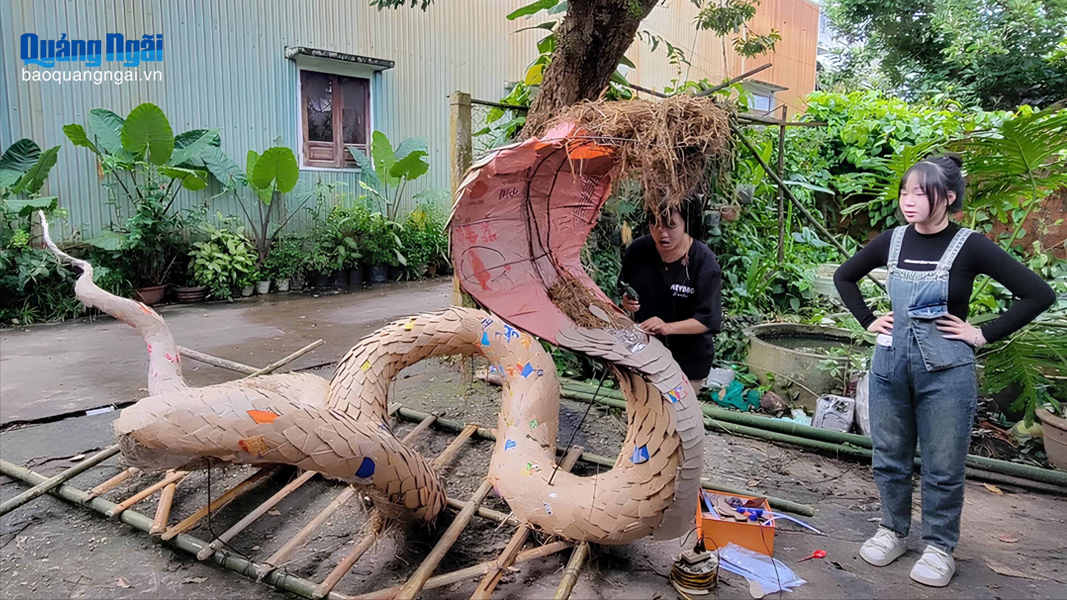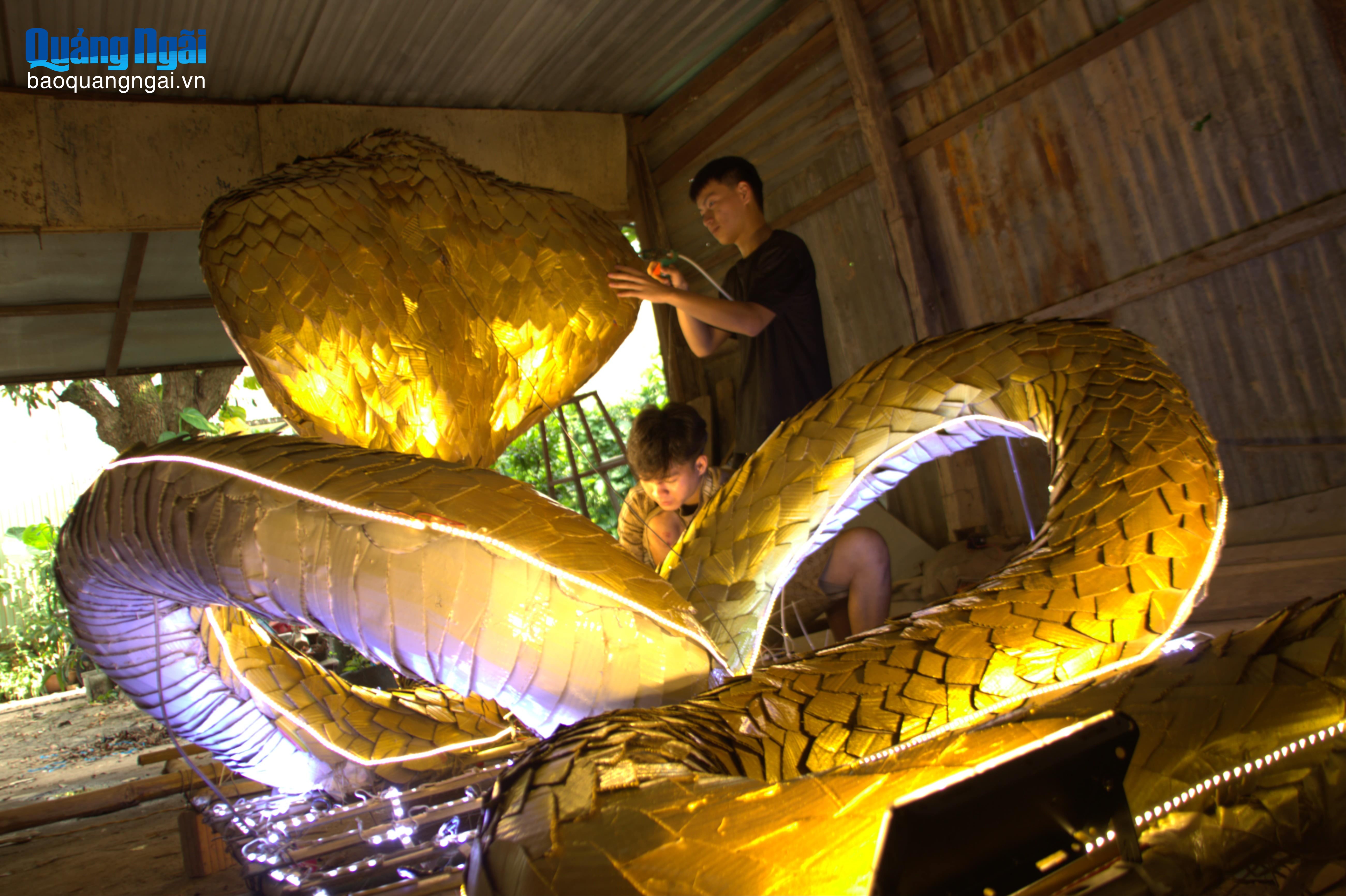 “Khung lồng đèn mang tên Hoàng Xà Lê Lợi được tạo từ tre và kẽm, phần thân được phủ rơm và bìa carton. Riêng phần vảy, nhóm em đã tỉ mỉ cắt hơn 1.000 miếng carton để ghép thành từng lớp, tạo nên hình ảnh rắn vàng sống động và uyển chuyển”, em Hoàng Trọng Nghĩa, Trưởng nhóm liên quân Hoàng Xà Lê Lợi, Trường THPT Lê Lợi, cho biết.