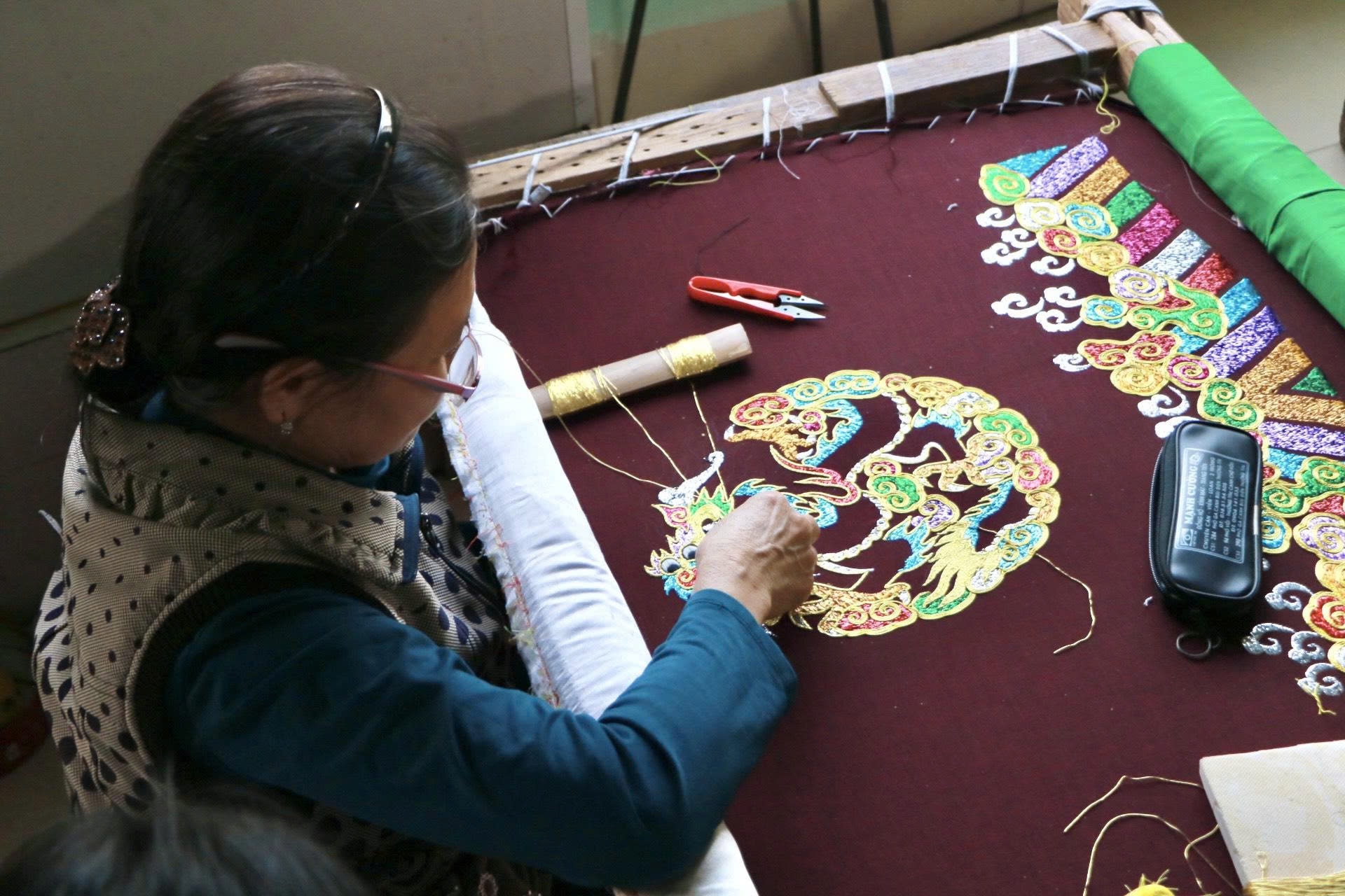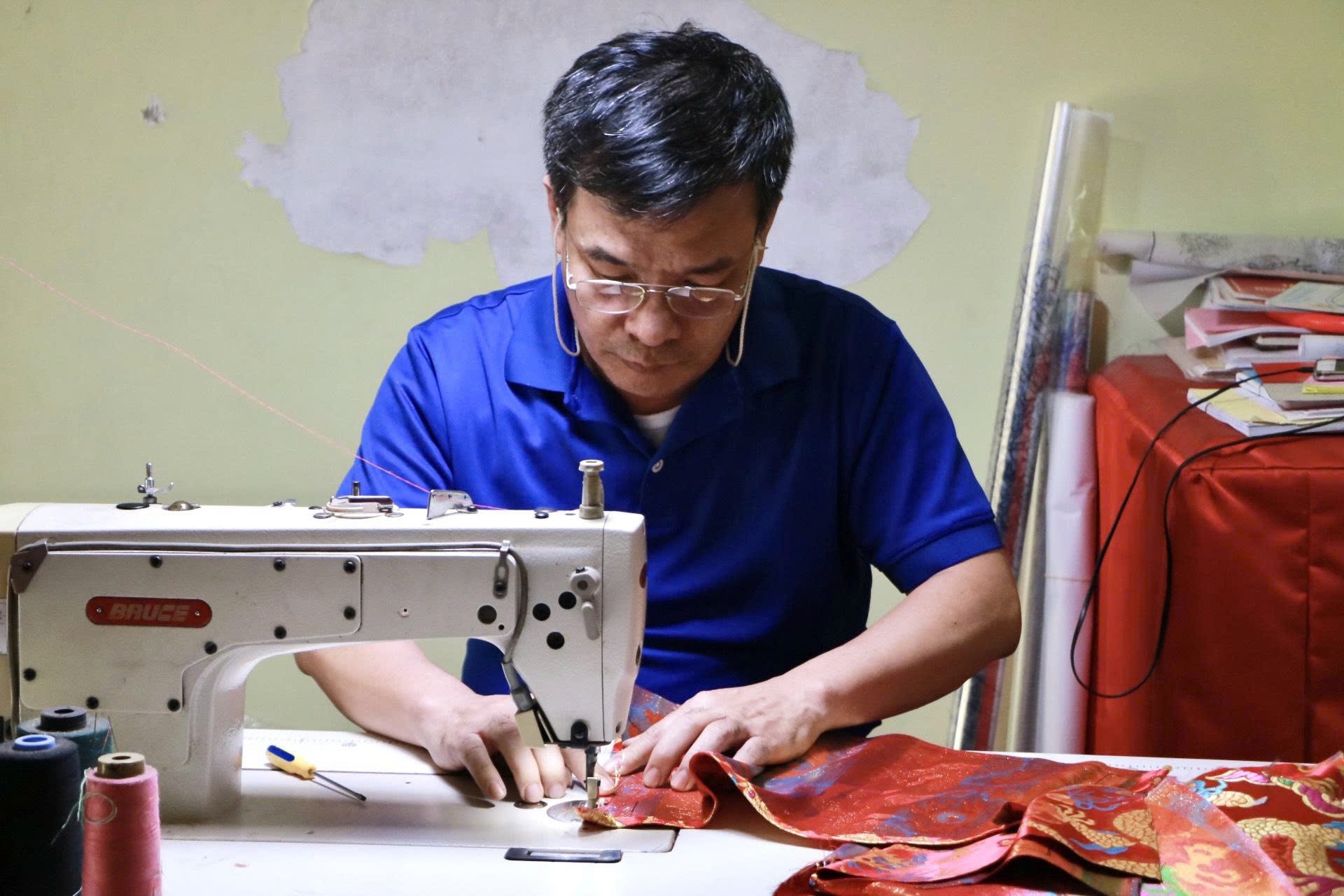Ông Nguyễn Thế Du đang hoàn thiện sản phẩm thêu