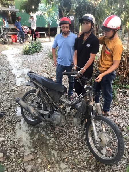 Đối tượng Đoan (đứng giữa) và chiếc xe máy bị “lột da”.