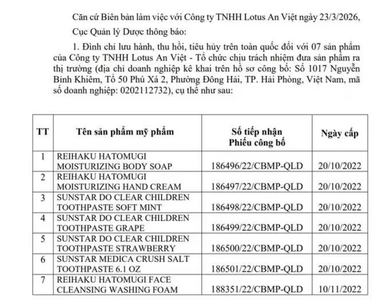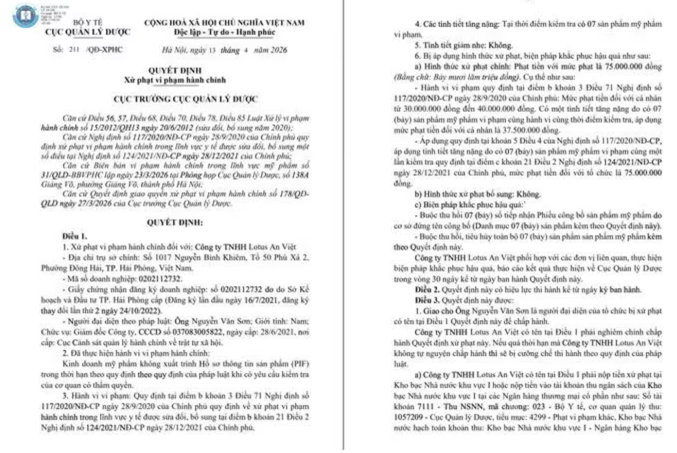 Công ty TNHH Lotus An Việt vừa bị Cục Quản lý Dược (Bộ Y tế) ban hành Quyết định số 211/QĐ-XPHC ngày 13/4/2026 xử phạt vi phạm hành chính trong lĩnh vực mỹ phẩm.