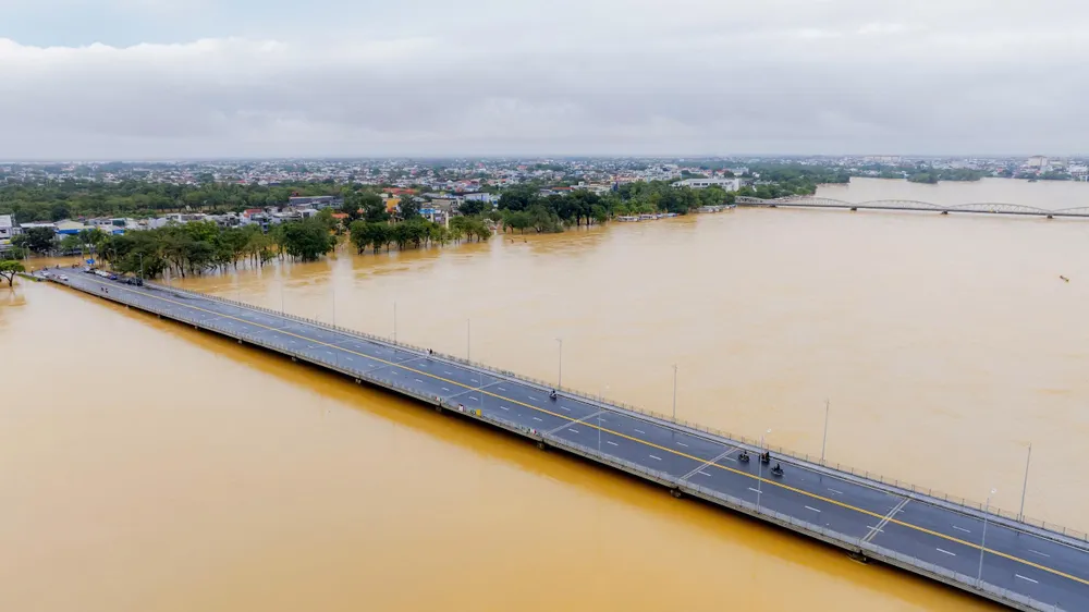 Mưa lớn khiến nước lũ trên sông Hương và sông Bồ vượt mức báo động 3. Vào lúc 16 giờ cùng ngày, lũ trên sông Hương (tại trạm Kim Long) đạt 4,11 m (vượt báo động 3 là 0,61 m). Sông Bồ đạt 5,15 m (vượt báo động 3 là 0,63m). Ảnh: ĐÌNH HOÀNG