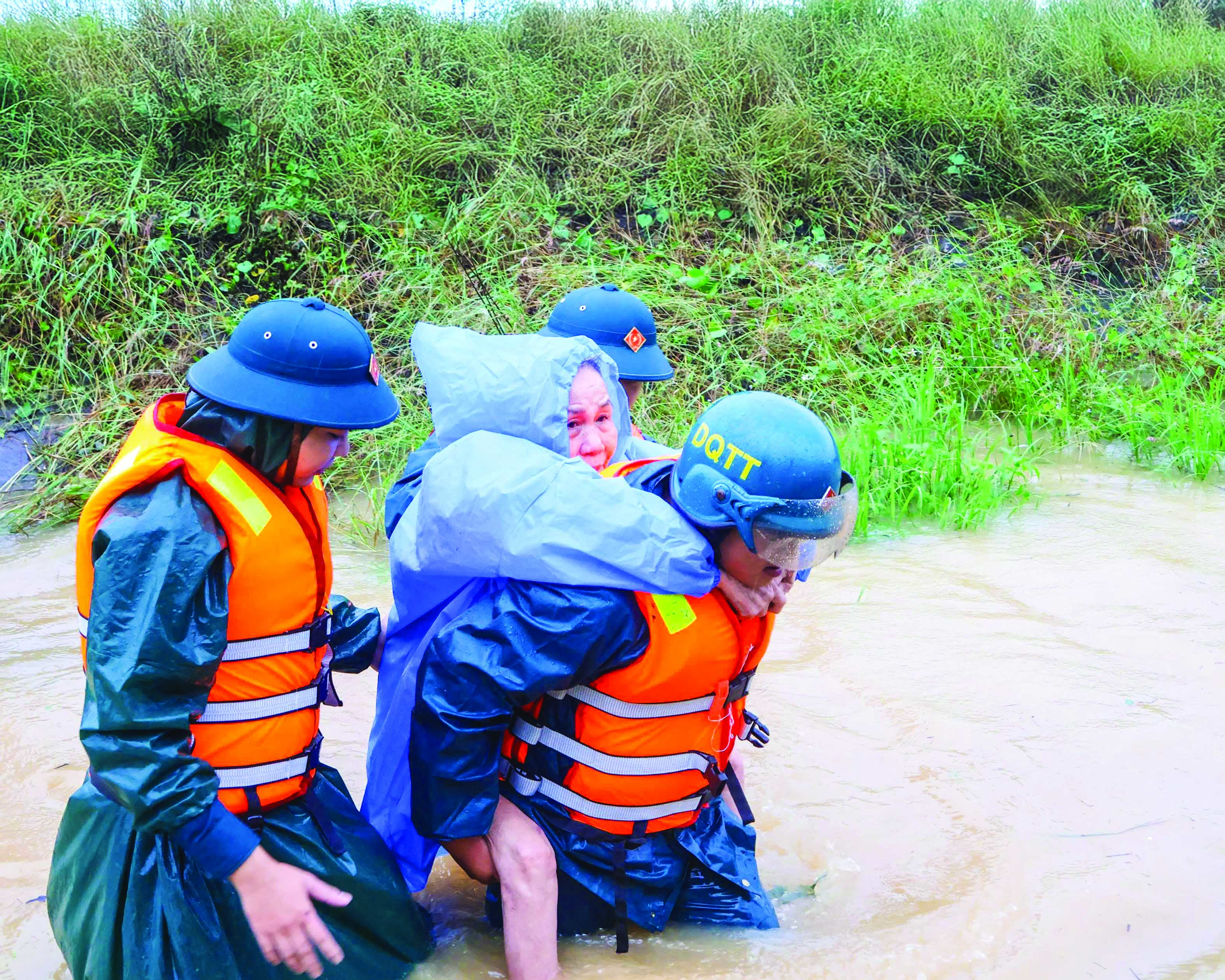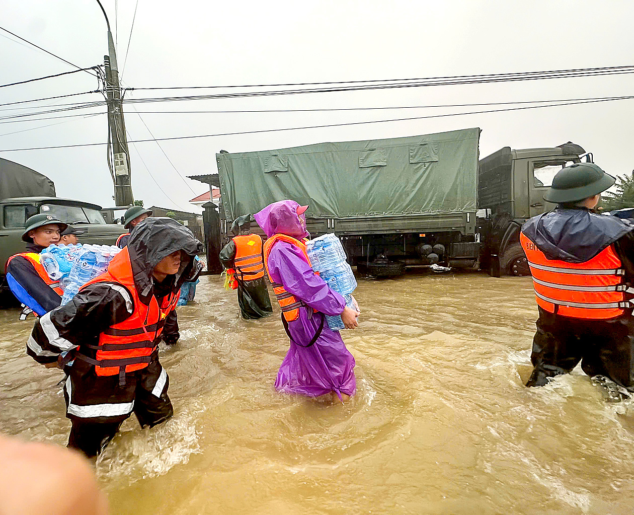 Lực lượng vũ trang TP Đà Nẵng vận chuyển nhu yếu phẩm để tiếp tế cho Bệnh viện Đa khoa khu vực Quảng Nam đang bị lũ bao vây. Ảnh: NGUYỄN CƯỜNG