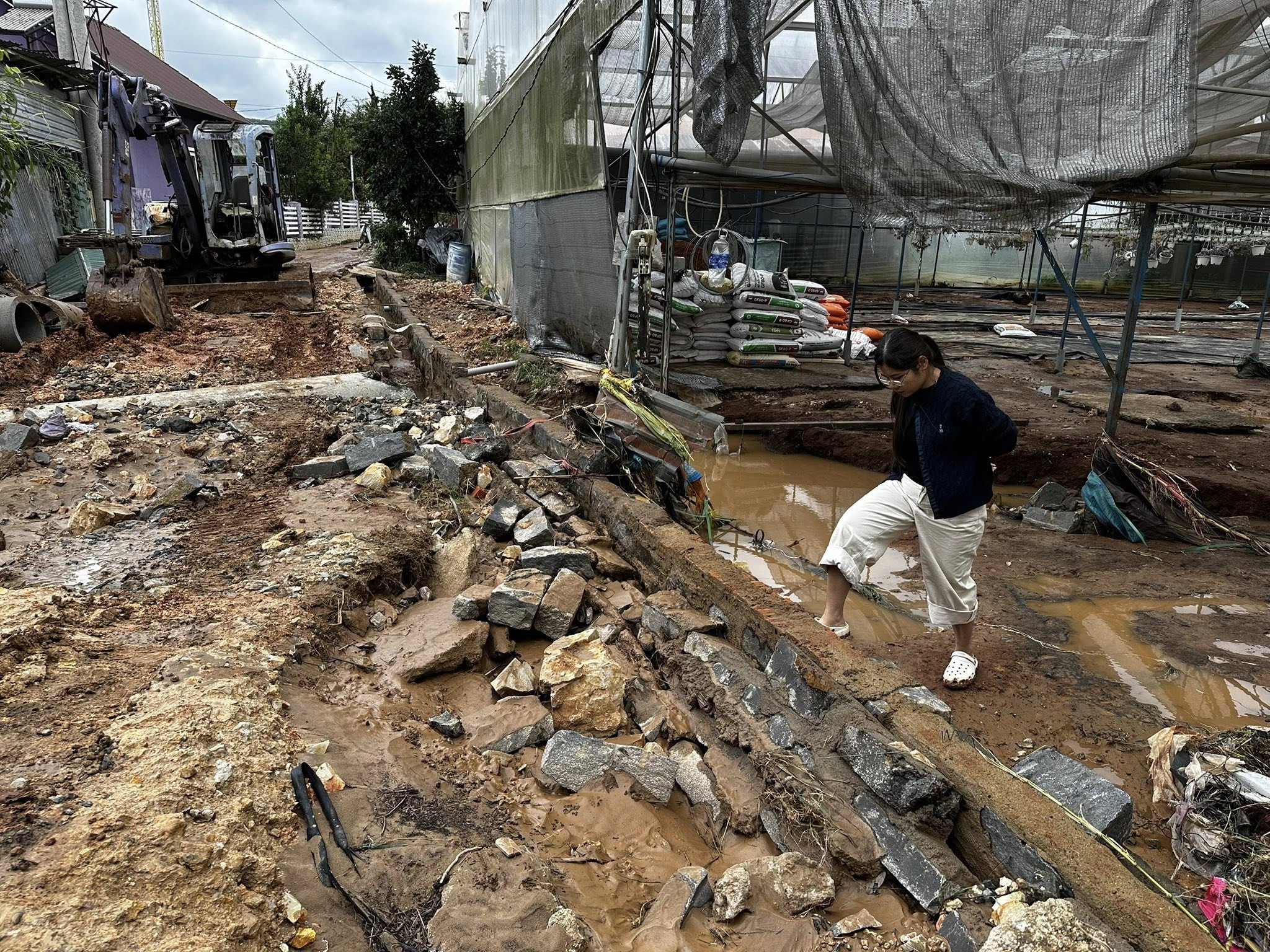 Chủ vườn cho biết sau trận lũ khiến 1/3 vườn sen đá bị cuốn trôi, anh đã tiến hành xây thêm kè đá, đắp đất cao lên một mét để ngăn nước suối tràn qua. Tuy nhiên, nước lũ đã đánh vỡ cả bờ kè.