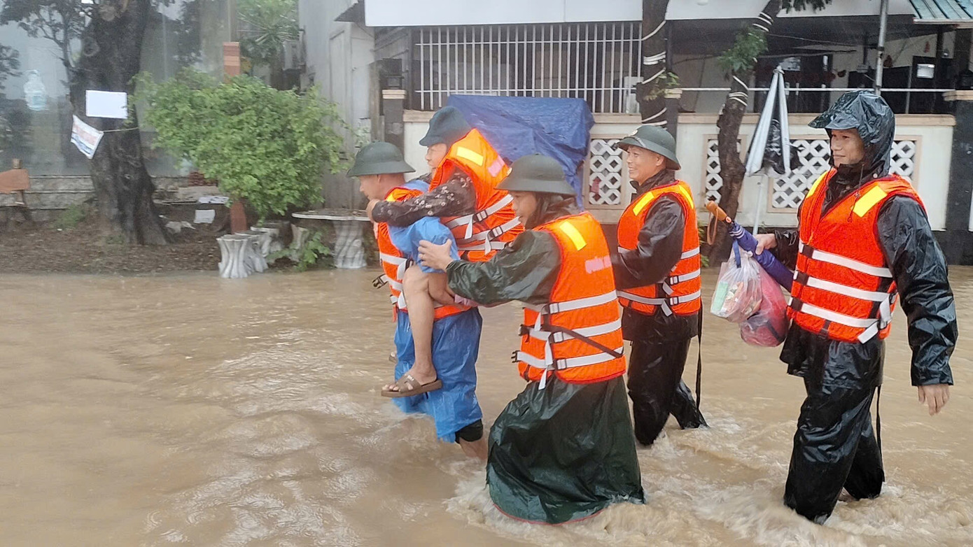 Chiều 27/10, cán bộ, chiến sĩ Ban Chỉ huy Phòng thủ Khu vực 5 (Điện Bàn) phối hợp cùng lực lượng dân quân, công an và các đoàn thể địa phương đã khẩn trương di dời nhiều người dân đến nơi an toàn. Trong ảnh: Cụ Trương Thị Mai (82 tuổi, trú thôn Nghĩa Mỹ, xã Đại Lộc) đang được lực lượng chức năng hỗ trợ đưa ra khỏi vùng ngập sâu.
