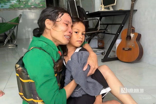 Bà Trương Thị Can gặp lại con sau khi được lực lượng cứu hộ ứng cứu tại khu vực bị cô lập do nước lũ