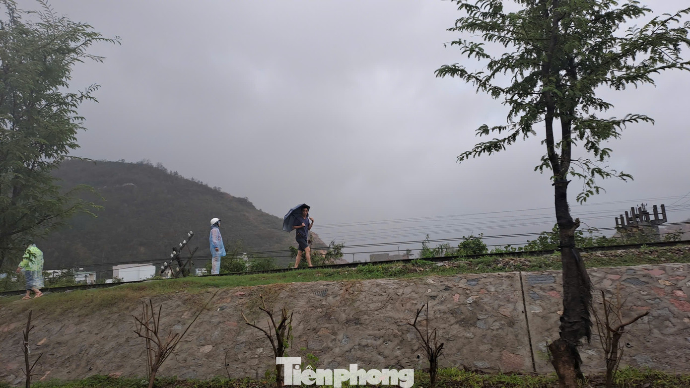 Tuyến đường Hùng Vương bị ngập, người dân phải lên đường ray xe lửa để di chuyển. Ảnh: Trương Định.