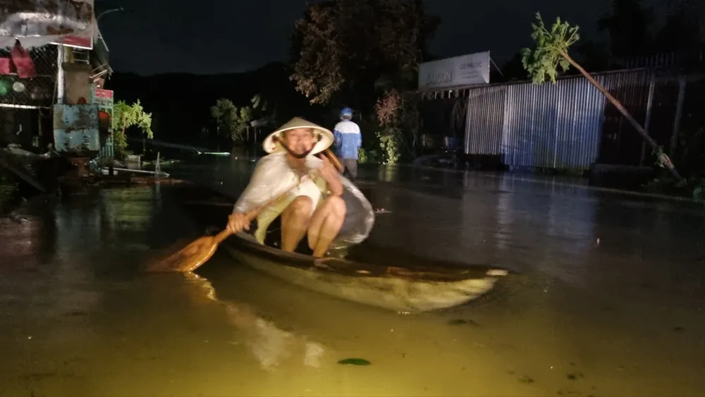Trong vòng khoảng 30 phút, nước đã dâng gây ngập nặng tuyến giao thông chính ở thôn Phước Nhuận, người dân phải chèo xuồng di chuyển.