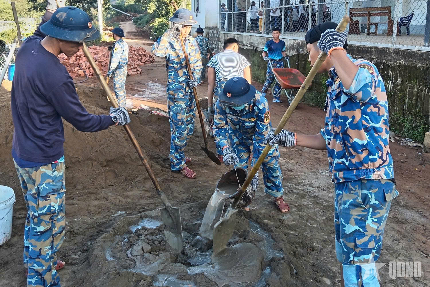 Trên đường vào xã Tây Khánh Sơn, cán bộ, chiến sĩ Lữ đoàn 162 đang phối hợp với các lực lượng san, gạt, mở đường đưa vật liệu vào vị trí tập kết để triển khai thi công. Những bộ quân phục dã chiến ướt đẫm mồ hôi, những tay xẻng, tay cuốc đang thoăn thoắt xúc đất đá lên các xe rùa nhanh chóng thông tuyến cho con đường độc đạo vào xã. Mặc dù công việc xây dựng khá vất vả, thời tiết có lúc không thuận lợi nhưng cán bộ, chiến sĩ rất phấn khởi, thi đua quyết tâm hoàn thành vượt tiến độ đề ra.