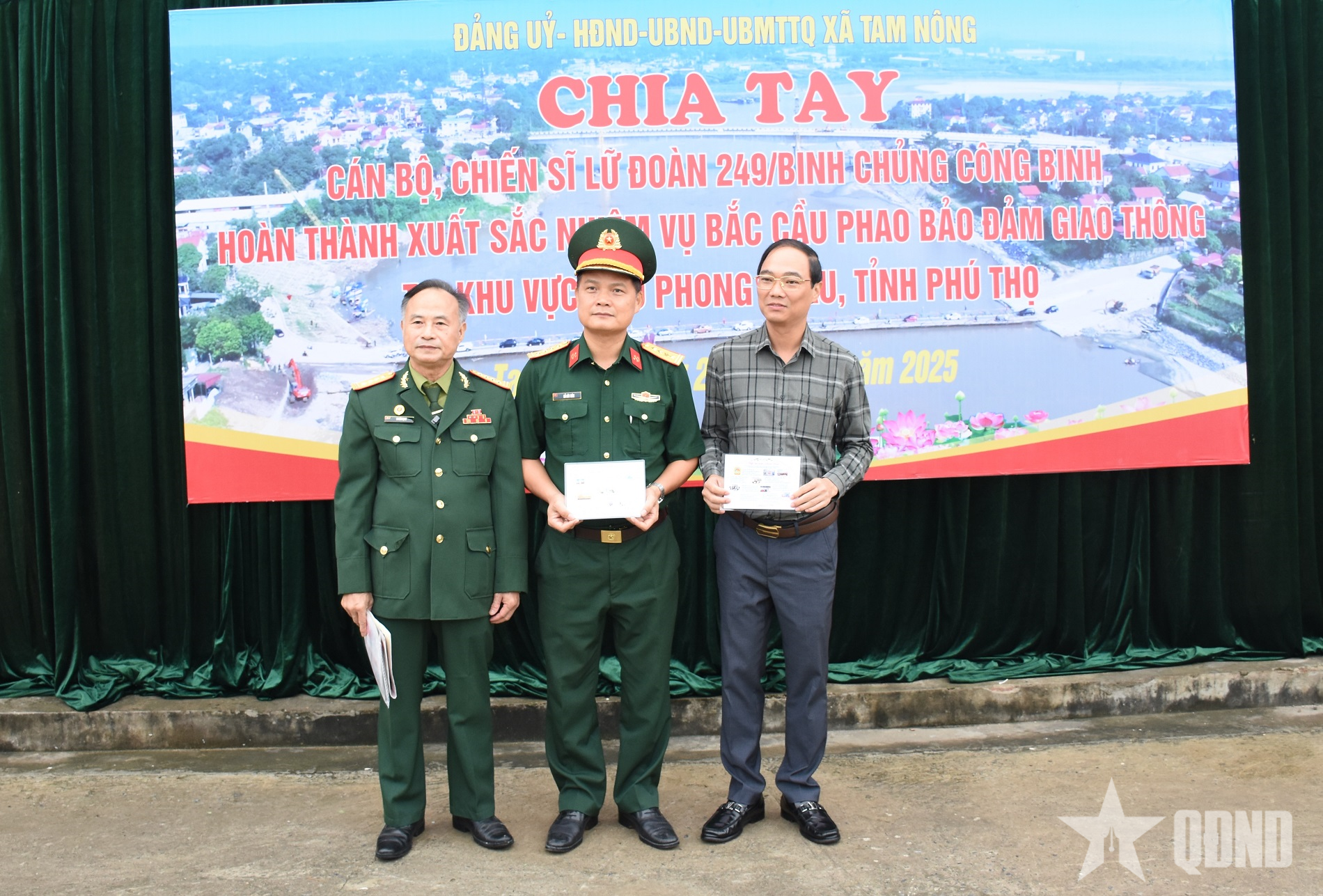 Giây phút chia tay thật lưu luyến. Cán bộ, nhân dân địa phương đứng dọc hai bên đường nắm tay bộ đội thật chặt. Con đường đã in dấu bước chân Bộ đội Công binh suốt hơn một năm cơ động thực hiện nhiệm vụ lắp đặt, vận hành cầu phao, canh gác, điều tiết giao thông. Thời gian thực hiện nhiệm vụ tại đây để lại trong lòng mỗi cán bộ, chiến sĩ Lữ đoàn 249 tình cảm sâu nặng. Sự hỗ trợ kịp thời về vật chất, tinh thần, những bữa cơm nghĩa tình, những phần quà và những lời động viên chân thành sẽ mãi là kỷ niệm đẹp, là minh chứng sinh động cho tình đoàn kết quân-dân gắn bó keo sơn. Trong hành trang những người lính trẻ trở về đơn vị vẫn luôn lưu giữ tình cảm của bà con địa phương gửi gắm, trở thành động lực để quyết tâm thực hiện tốt mọi nhiệm vụ được giao.