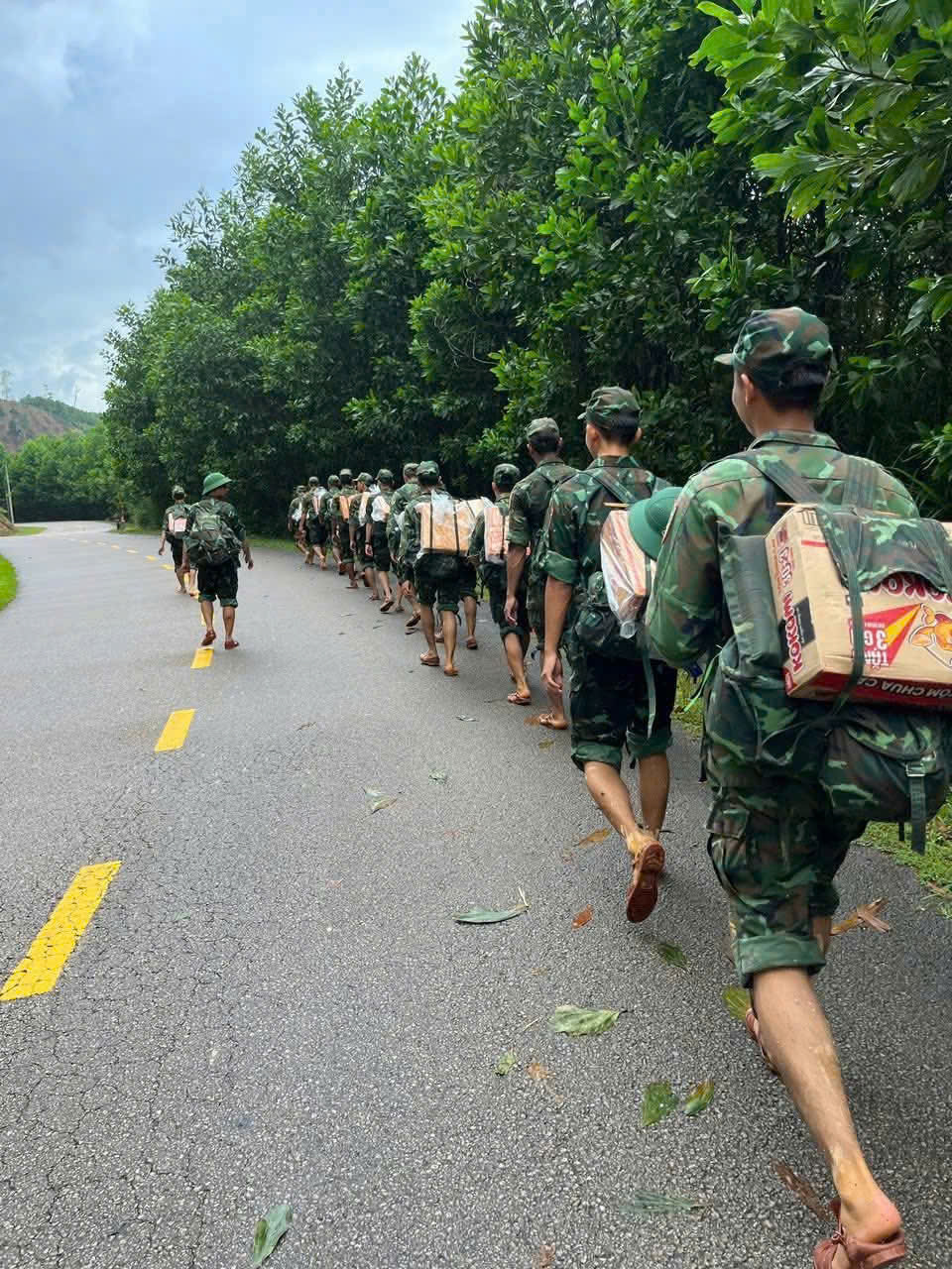 Từng thùng mì tôm, túi bánh, nước uống và vật dụng thiết yếu được các anh chia nhau mang đi trong điều kiện đường núi trơn trượt, mưa dai dẳng. Có đoạn, chiến sĩ phải lội bùn đến đầu gối, có nơi lại vượt qua vách núi sạt lở mới đến được thôn.