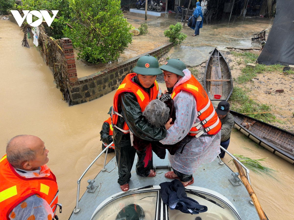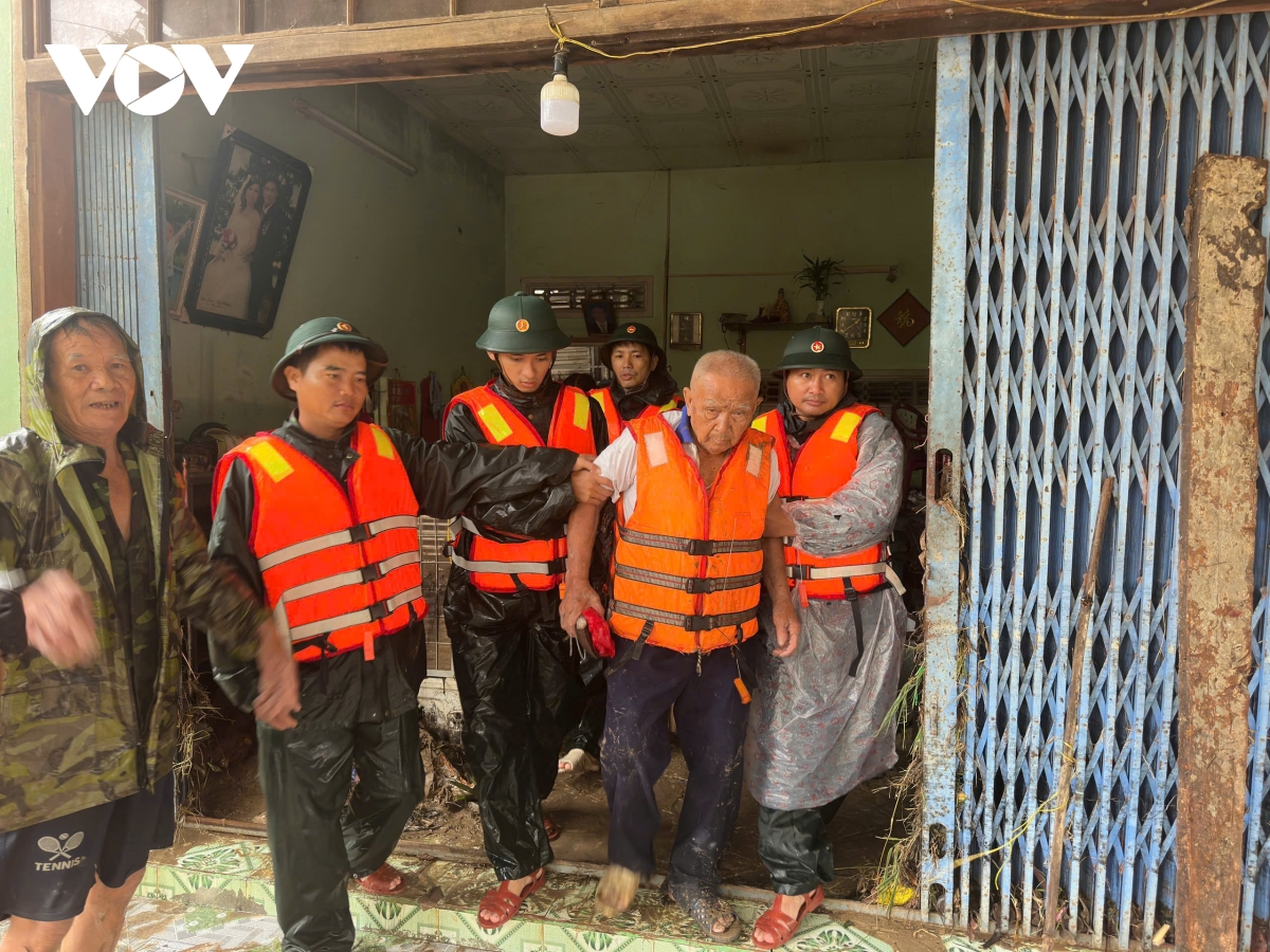 Sáng 20/11, các tổ công tác của Lữ đoàn 572 sử dụng ca nô và xuồng máy vượt dòng nước xiết đưa 22 người dân, gồm người già, phụ nữ và trẻ em, ra khỏi vùng ngập sâu.