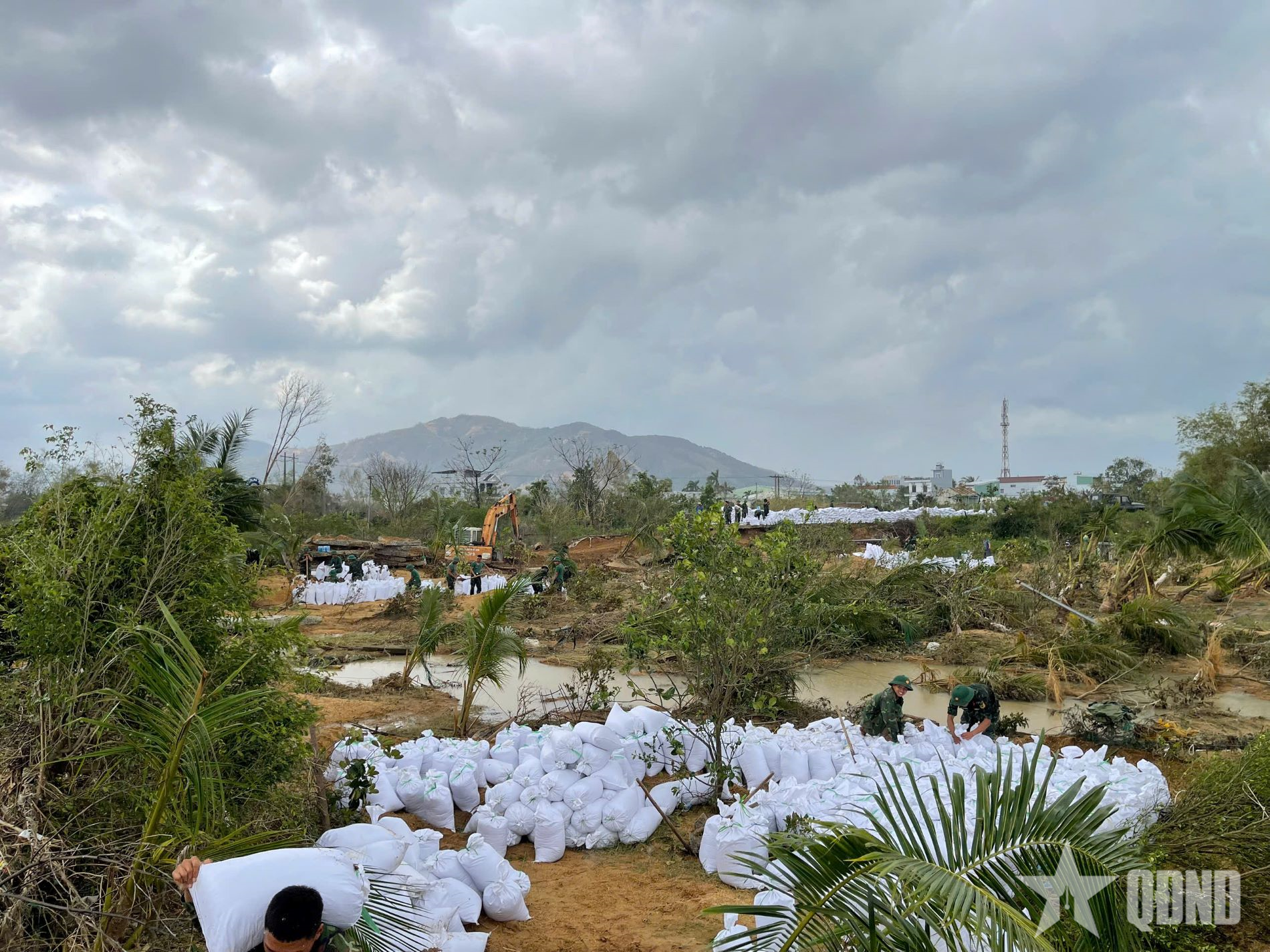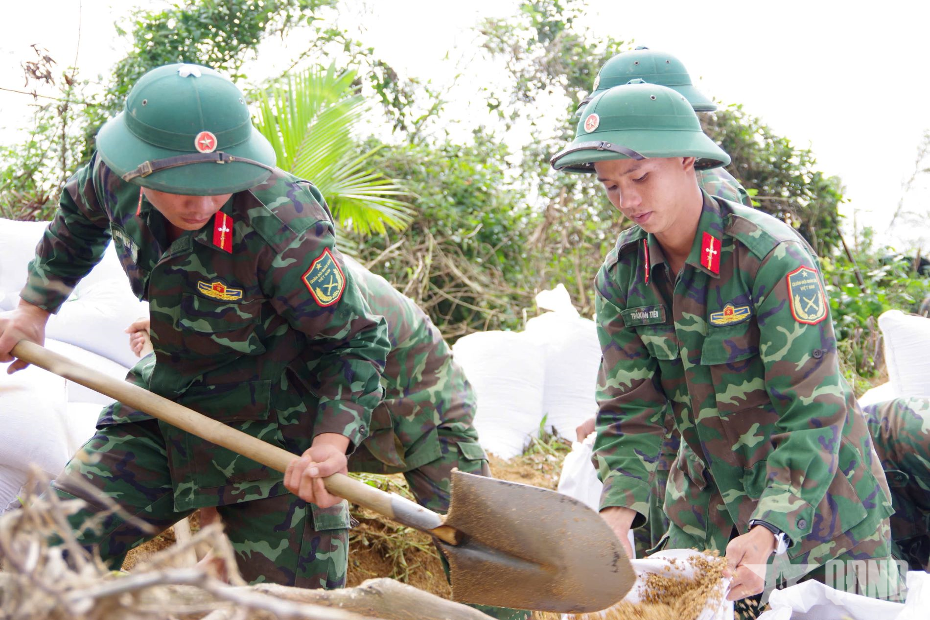 Sau khi nhận thông tin, Lữ đoàn 573 đã cử hơn 100 cán bộ, chiến sĩ phối hợp với cấp ủy, chính quyền địa phương lên phương án, chuẩn bị vật chất, phương tiện, bao tải cát, đất, đá để chèn, gia cố thân đê.