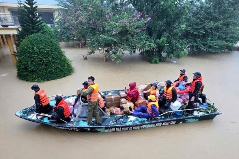 Xuồng cứu hộ của Lữ đoàn 680 chở hàng hóa đến những khu vực ngập sâu để hỗ trợ người dân.