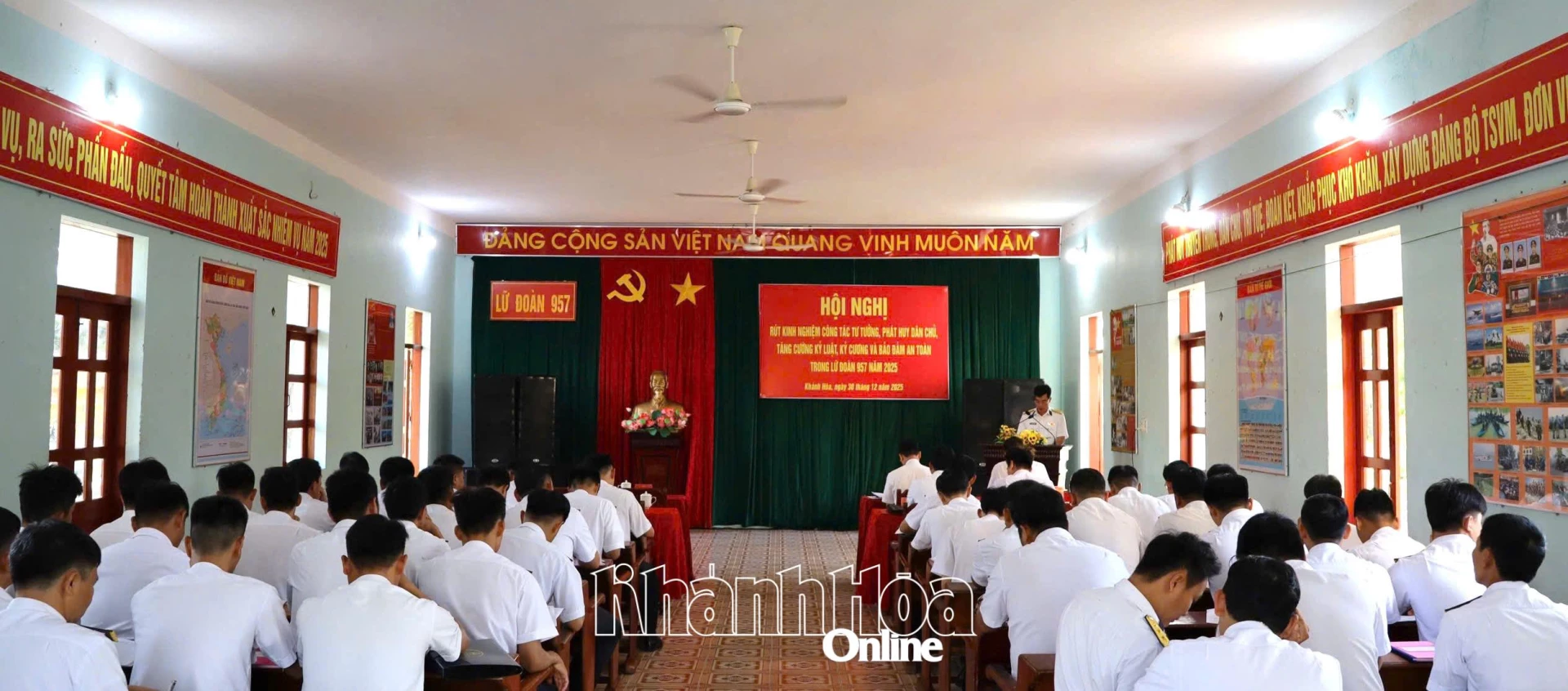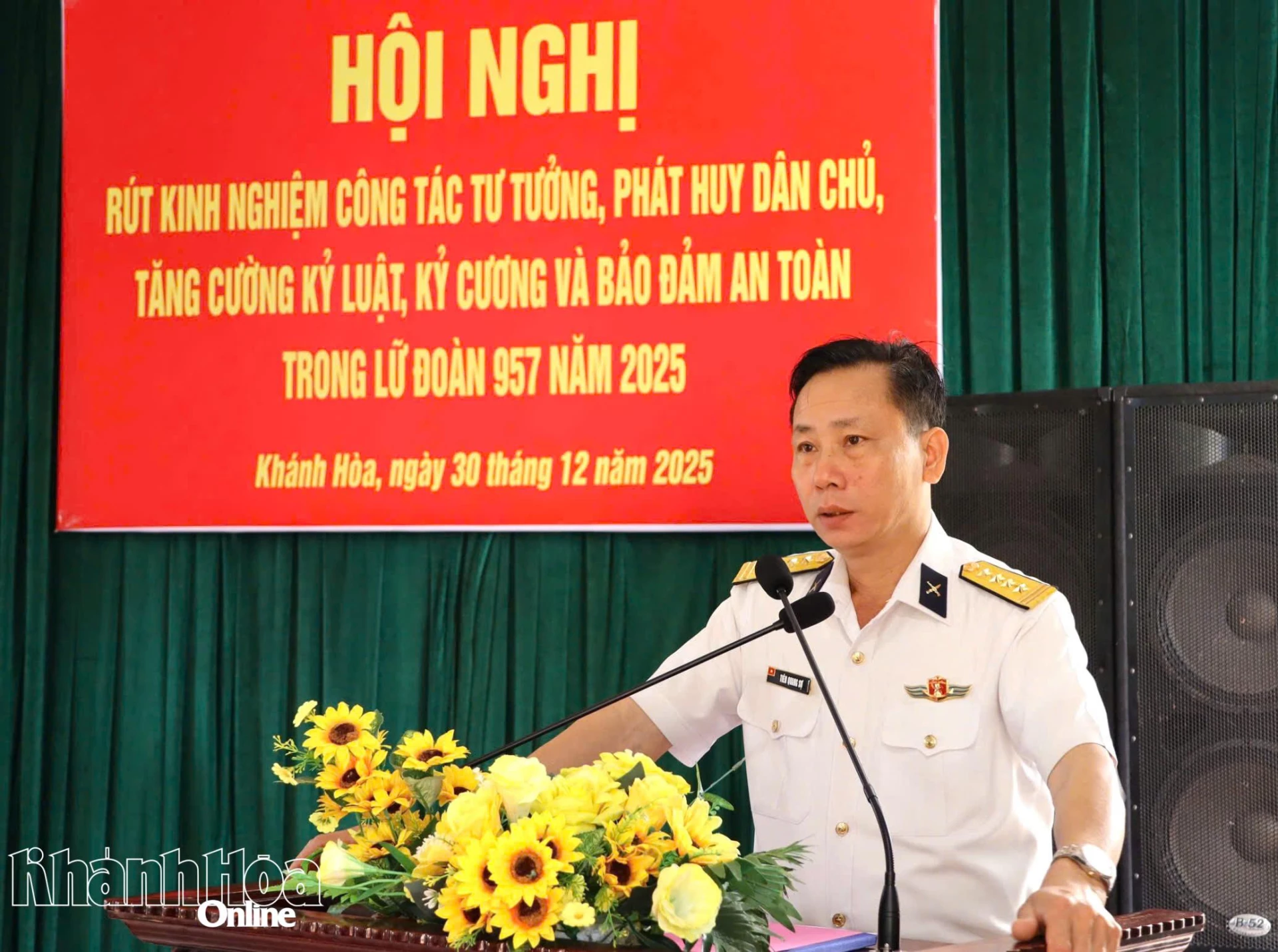 Ngày 30-12, Lữ đoàn 957, Vùng 4 Hải quân tổ chức hội nghị rút kinh nghiệm công tác quản lý tư tưởng, phát huy dân chủ, tăng cường kỷ luật, kỷ cương và bảo đảm an toàn năm 2025. Đại tá Tiên Quang Sự - Bí thư Đảng ủy, Chính ủy Lữ đoàn 957 chủ trì hội nghị.