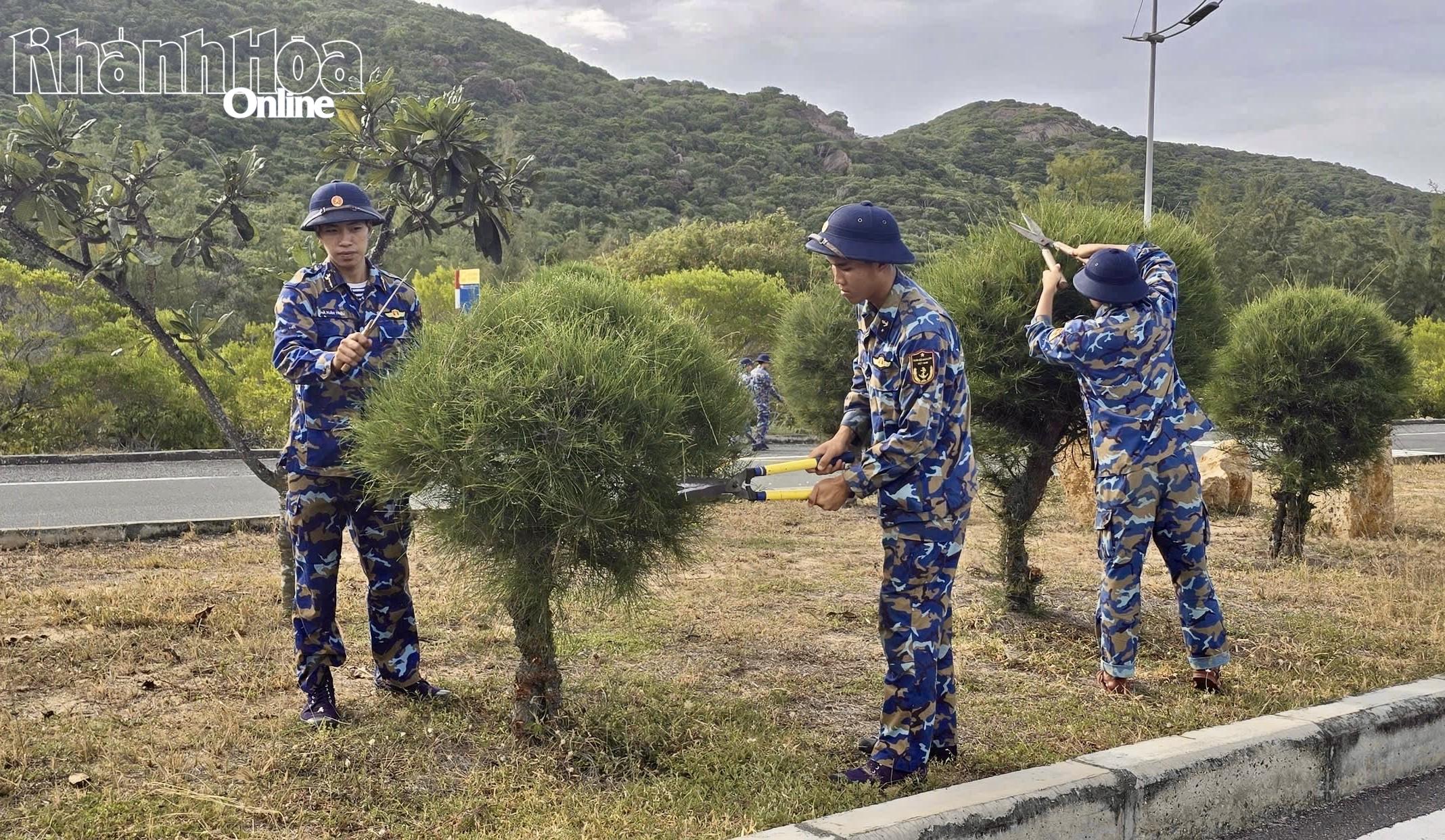 Cán bộ, chiến sĩ cắt tỉa cây xanh.