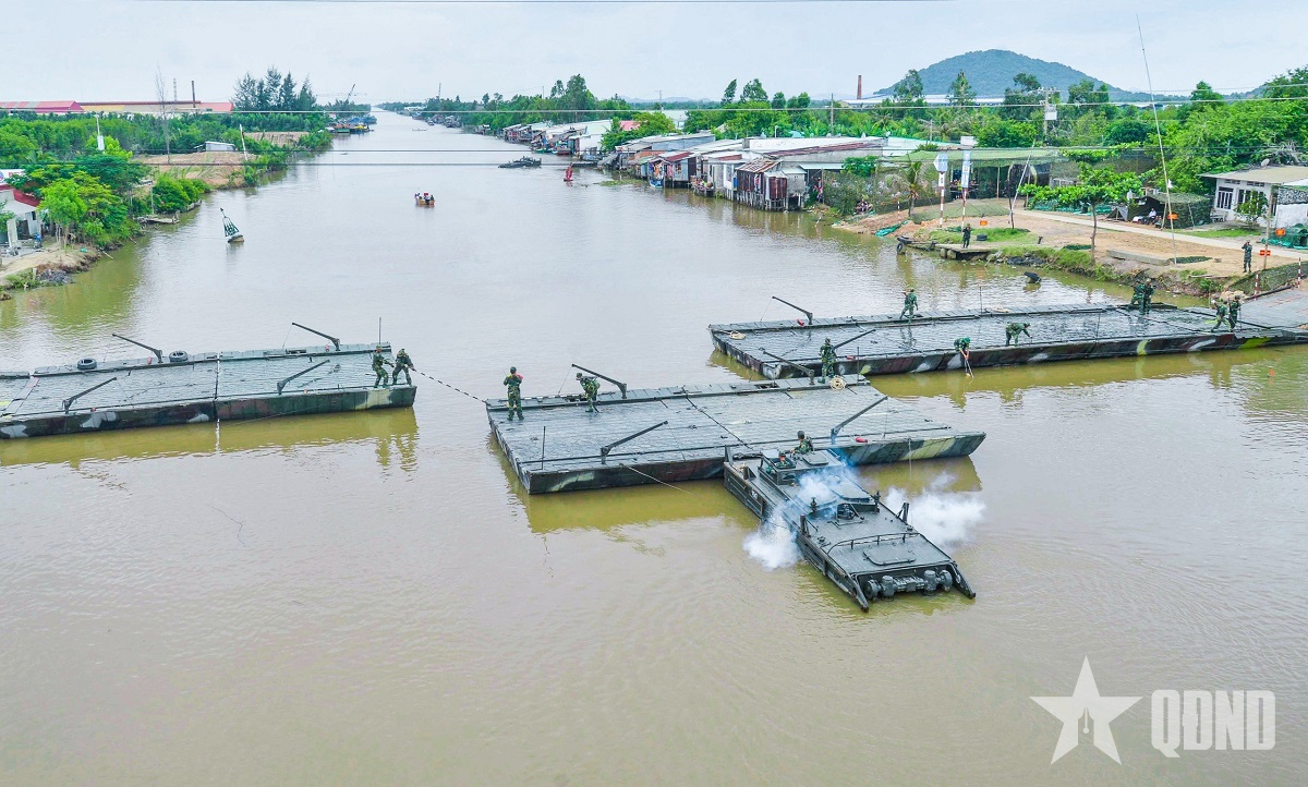 Cán bộ, chiến sĩ Lữ đoàn Công binh 25 (Quân khu 9) huấn luyện bắc cầu phao vượt sông.
