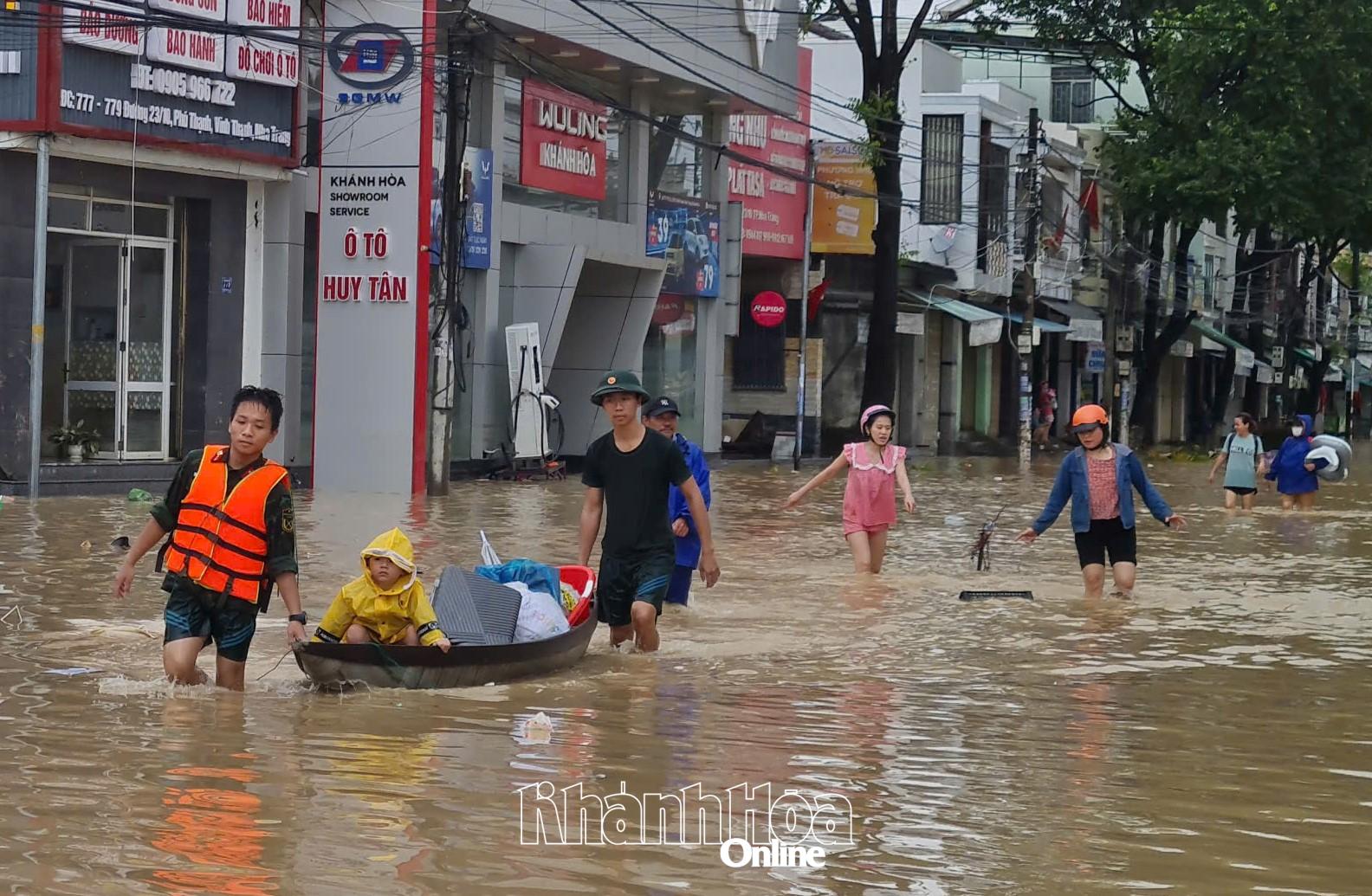 Các chiến sĩ Lữ đoàn Đặc công nước 5 di dời người dân vùng ngập sâu ở phường Tây Nha Trang đến nơi an toàn.