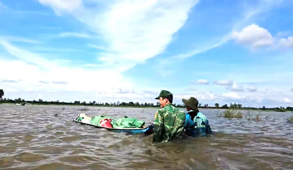 Tại xã Hưng Điền, mưa lớn ngày 26-10, khiến mực nước sông Trăng dâng nhanh, đe dọa 300 ha lúa sắp thu hoạch. Ngay sáng 27-10, Đồn Biên phòng Sông Trăng (tỉnh Tây Ninh) huy động hai tổ cán bộ, chiến sĩ phối hợp với người dân gia cố đê bao ở ấp Sông Trăng và ấp Bưng Ràm.