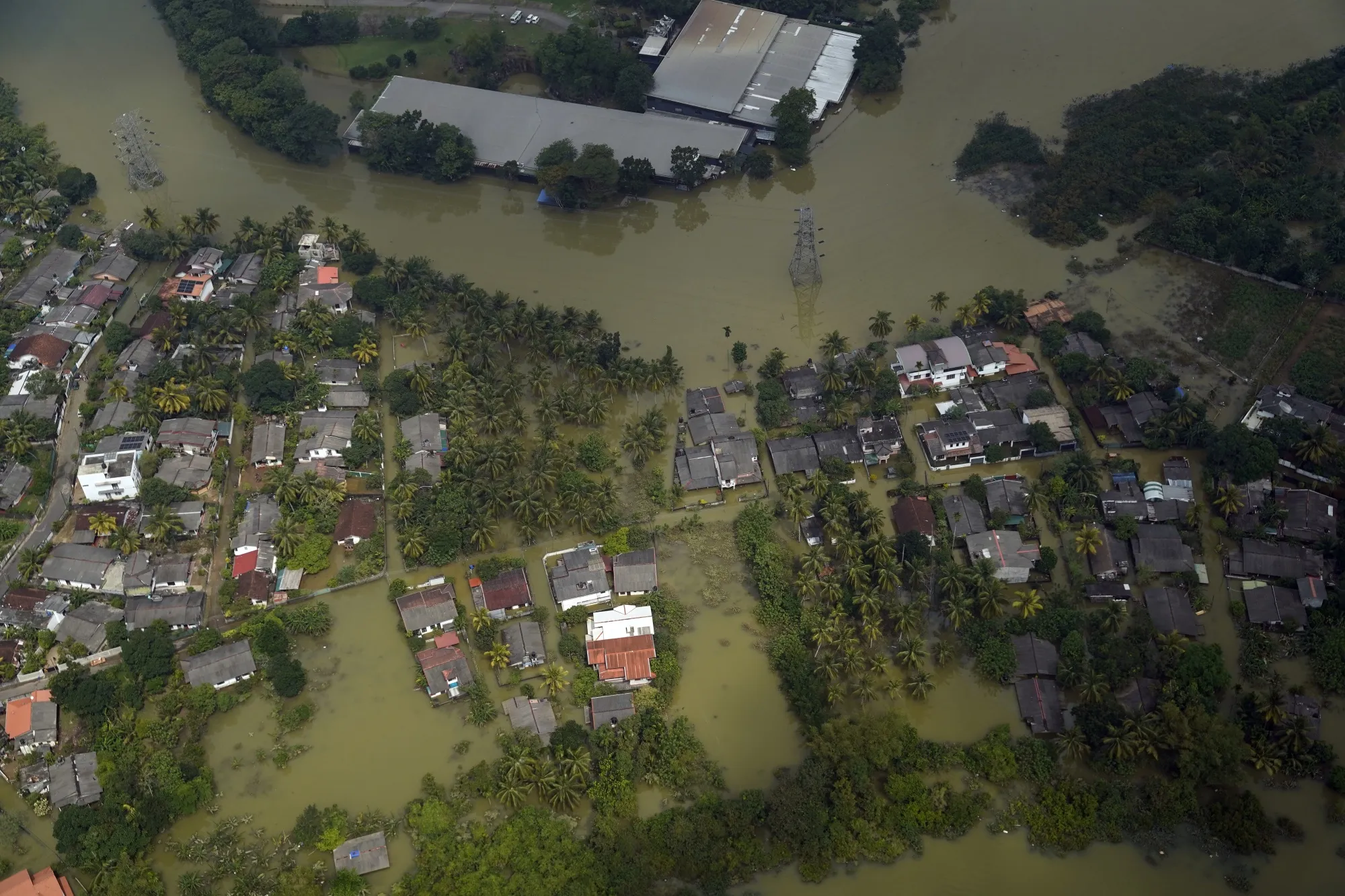 Khu dân cư bị ngập trong nước lũ ở Sri Lanka hôm 2/12. Ảnh: NurPhoto.