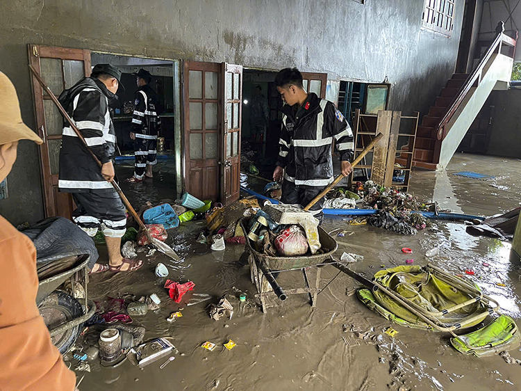 Lực lượng CSCĐ dọn dẹp bùn đất, vệ sinh nhà dân bị ảnh hưởng nặng nề sau ngập lụt.