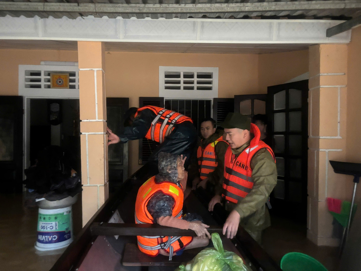 Lực lượng công an TP. Huế hỗ trợ di dời dân vùng tái ngập lụt đến nơi an toàn.