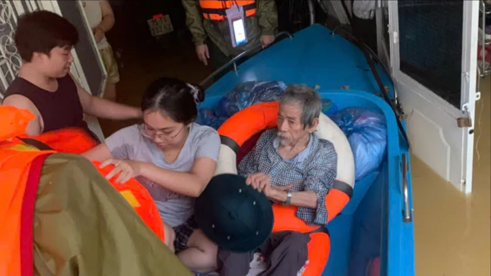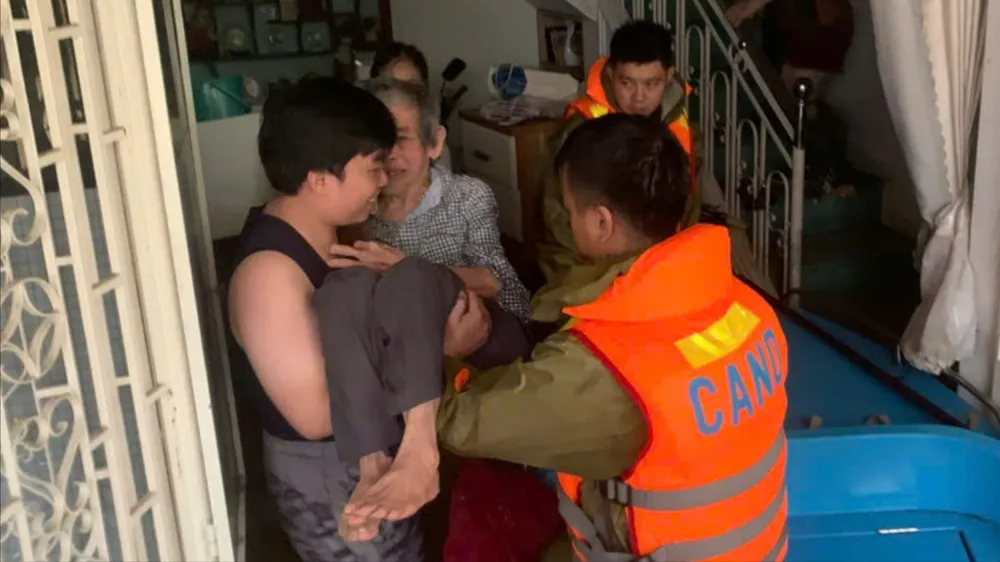 Cũng trong sáng nay, chiến sĩ Hồ Vĩnh Cường, Công an phường An Cựu, cùng lực lượng đã tiếp cận, cõng hai cụ bà từ nhà về trụ sở công an phường để trú ẩn an toàn, tránh dòng nước lũ đang lên.