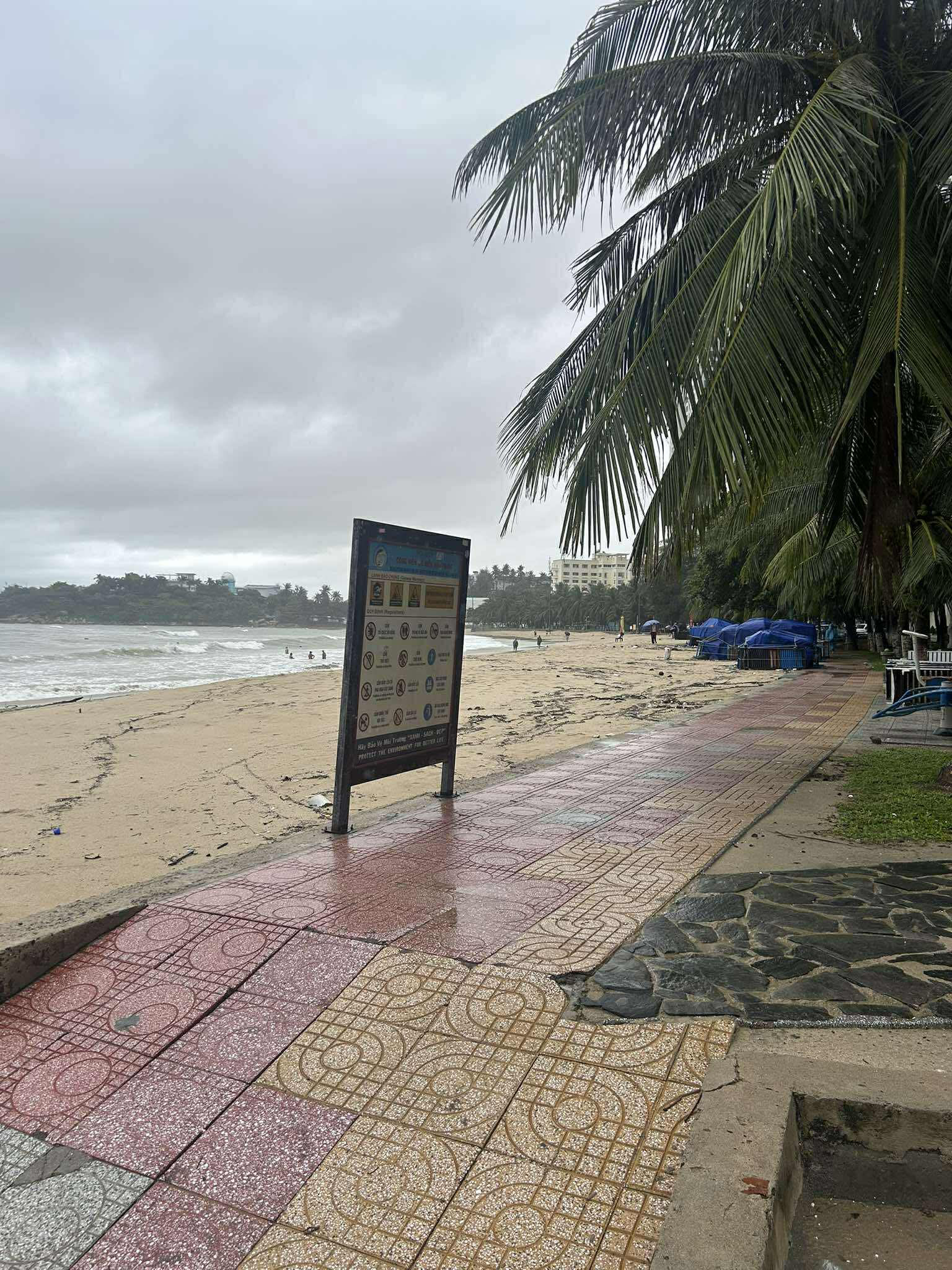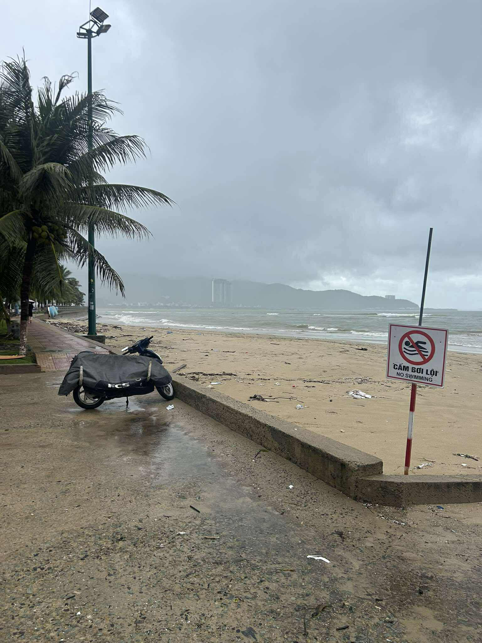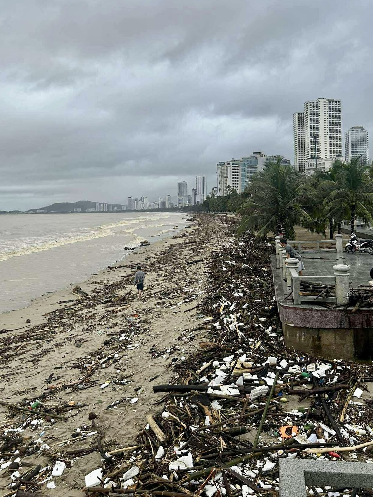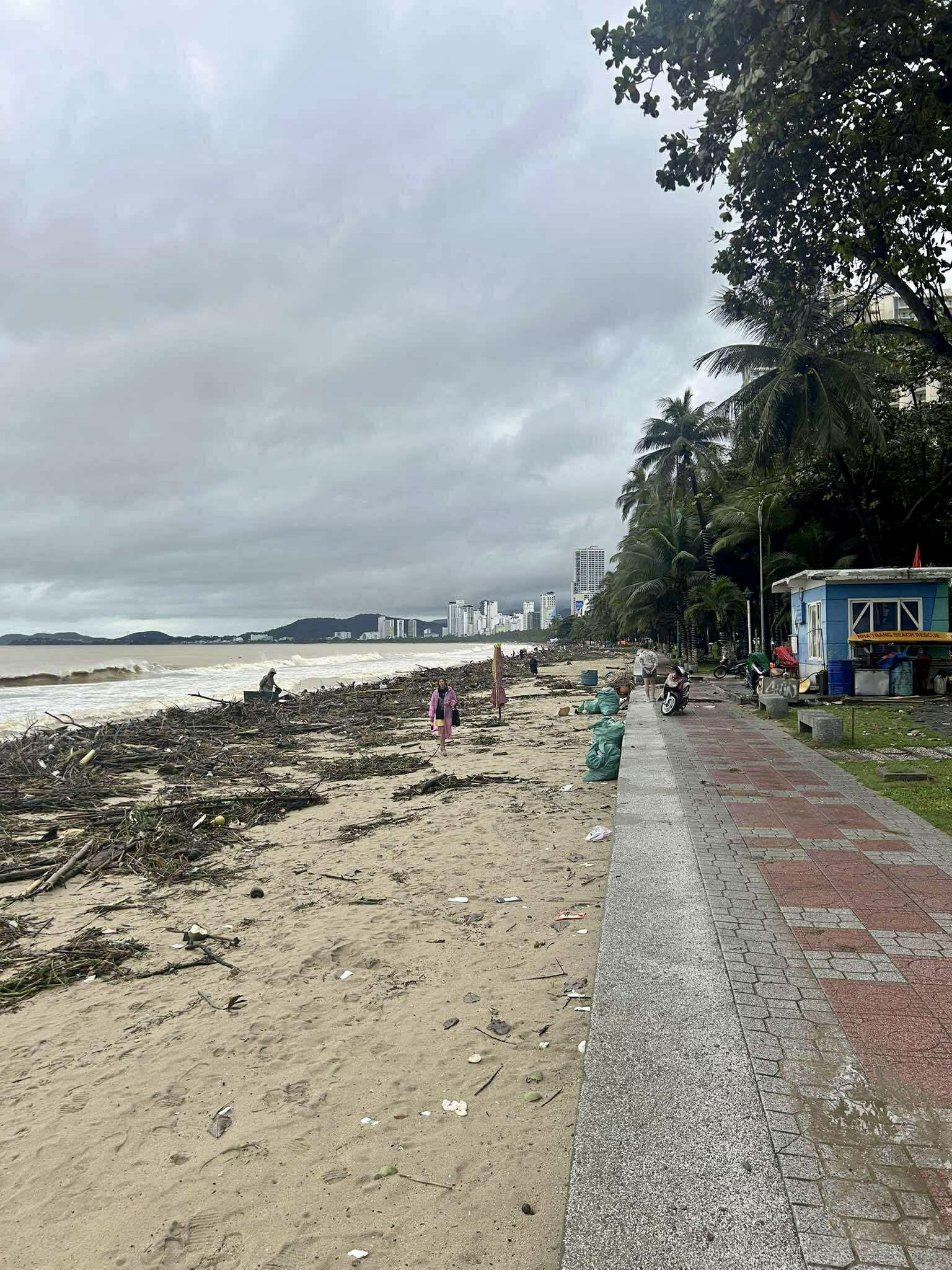Song song với tình trạng ngập úng, hạ tầng thiết yếu, không gian công cộng tại Nha Trang vẫn đang chịu ảnh hưởng nặng nề. Khoảng 10h30 sáng 21/11, bãi biển gần Quảng trường 2 Tháng 4 ngổn ngang cây gãy đổ, dù nhân viên môi trường tích cực dọn dẹp một ngày trước đó. Trong khi đó, bãi biển Hòn Chồng vẫn tương đối sạch sẽ. Nói với Tri Thức - Znews, anh Phan Văn Minh, người dân địa phương, cho biết hiện tượng dồn rác thải là bởi gió mạnh trong những ngày vừa qua, cuốn rác từ cửa sông Cái đoạn cầu Trần Phú vào khu vực bãi tắm trung tâm. Ảnh: Văn Minh.
