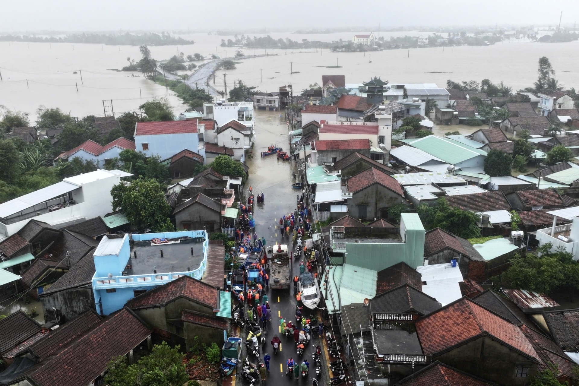 Đoàn cứu trợ, lực lượng chức năng địa phương tập trung vận chuyển lương thực cho người dân vùng ngập nặng tại Đông Hòa. Hình ảnh chụp trên cao một góc Đông Hòa lúc 9h ngày 21/11. Ảnh: Nghinh Phong Media.