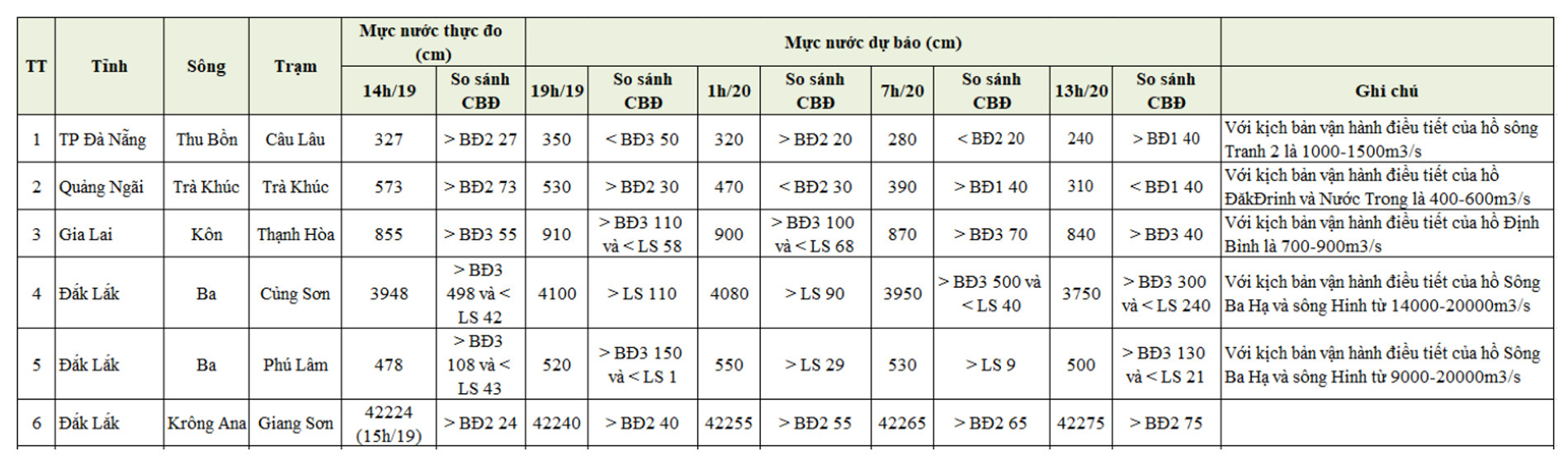 Dự báo, trong 12-24 giờ tiếp theo, lũ trên sông Kôn, sông Ba dao động ở mức rất cao và trên BĐ3. Trong 24 giờ tới, các sông khác ở Đắk Lắk, Khánh Hòa tiếp tục lên và ở mức BĐ2-BĐ3, có sông trên BĐ3.