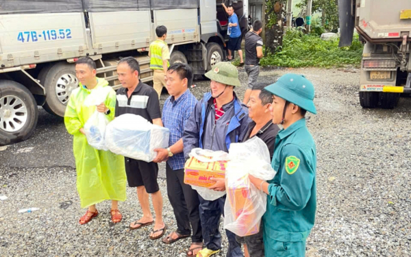 Công an xã Phước Năng trao nhu yếu phẩm tặng người dân bị mắc kẹt trên khu vực đèo Lò Xo do sạt lở.