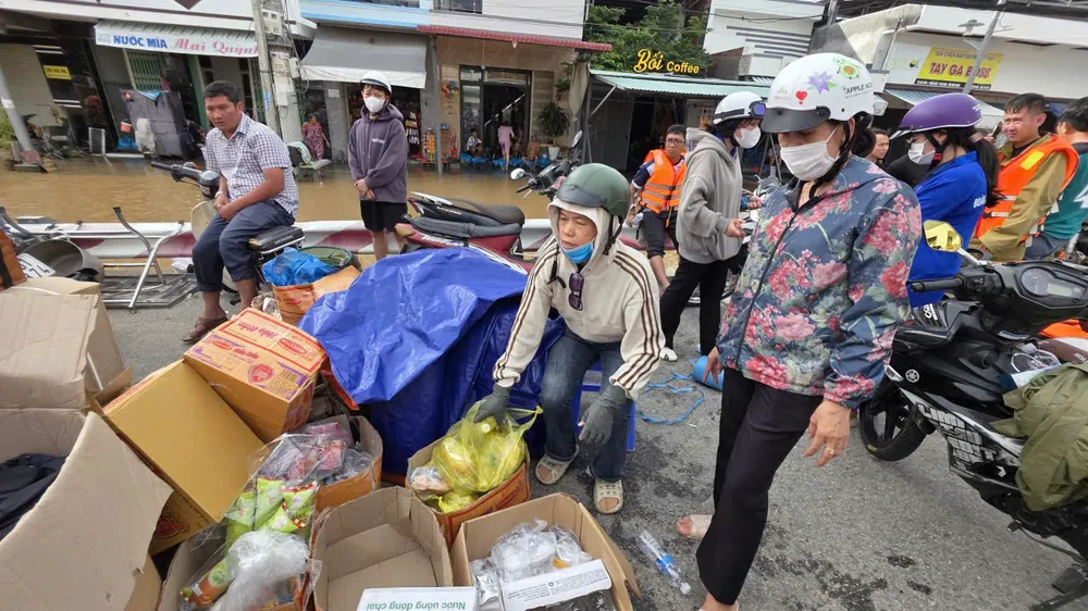 Người dân Phan Rang hỗ trợ thức ăn, nước uống cho người dân tại những điểm bị ngập lụt.