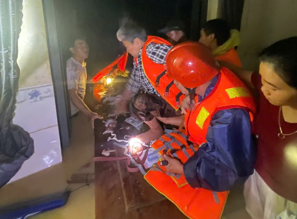 Lực lượng cứu hộ đưa cụ già bị liệt đi sơ tán trong đêm.