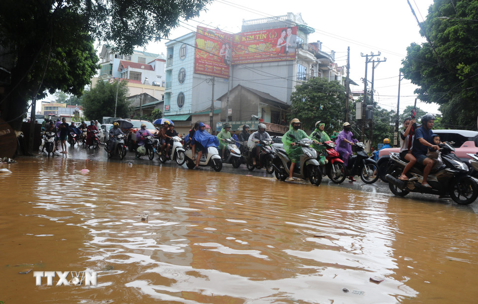 Tuyến phố chính Kim Đồng đang bị ngập lụt. (Ảnh: Chu Hiệu/TTXVN.)
