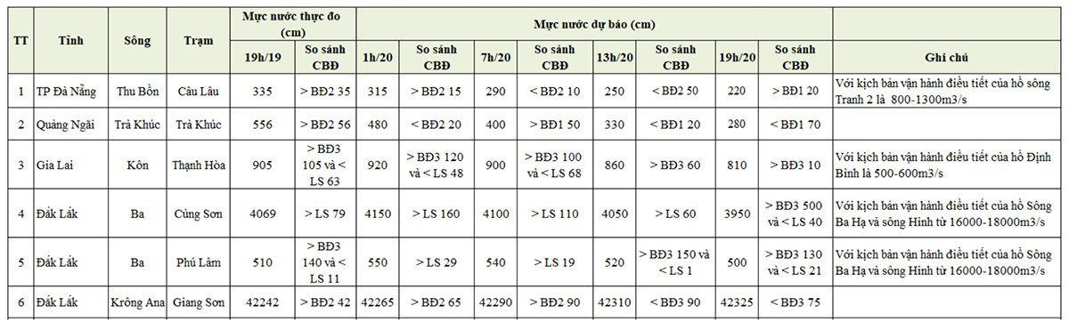 Trong 12-24 giờ tiếp theo, lũ trên sông Kôn, sông Ba dao động ở mức rất cao và trên BĐ3; sông Krông Ana tiếp tục lên và ở trên mức BĐ2; lũ trên sông Thu Bồn, sông Trà Khúc xuống dần và ở dưới mức BĐ1 đến trên BĐ1.