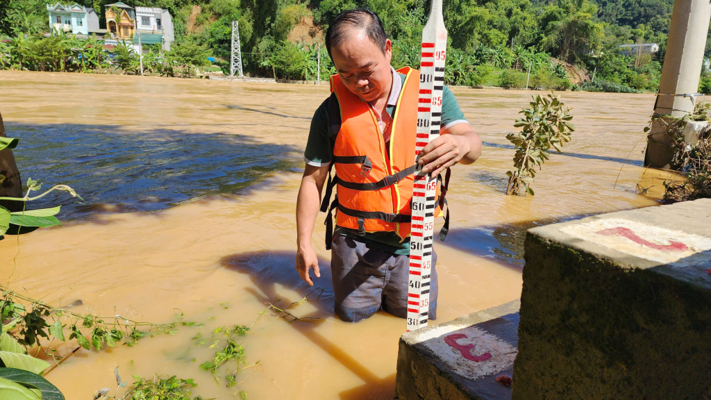 Cán bộ khí tượng thủy văn đo mực nước sông Bằng.