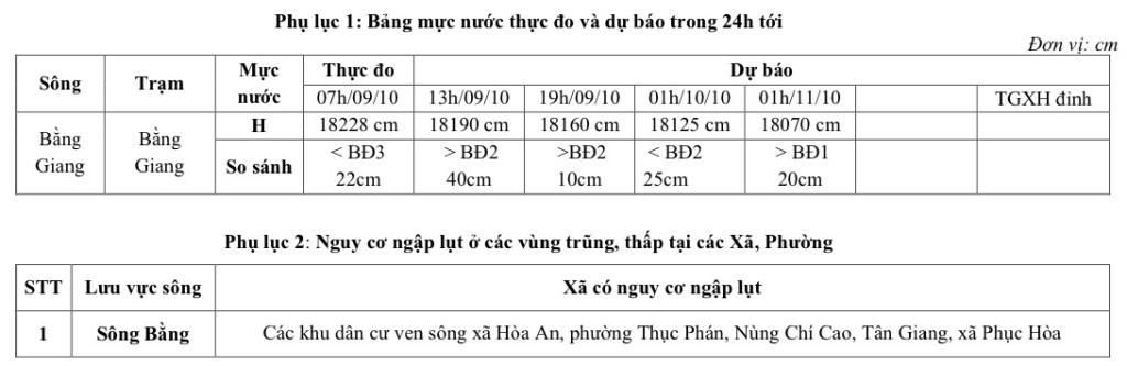 Xảy ra ngập lụt tại các vùng trũng thấp, ven sông suối, các khu dân cư, các khu đô thị ven sông Bằng; nguy cơ sạt lở đất nơi có địa hình dốc, khu vực có kết cấu đất đá yếu, kém ổn định, các công trình xây dựng, các khu bờ, bãi sông do đã có lượng mưa lớn.