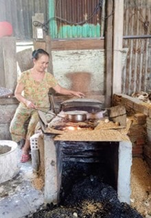 Bà Tào Thị Nhơn (thôn Mỹ Hảo, xã Vu Gia, Đà Nẵng) bên bếp lò tráng mỳ Quảng lúa cang bằng trấu. Ảnh: ANH QUÂN