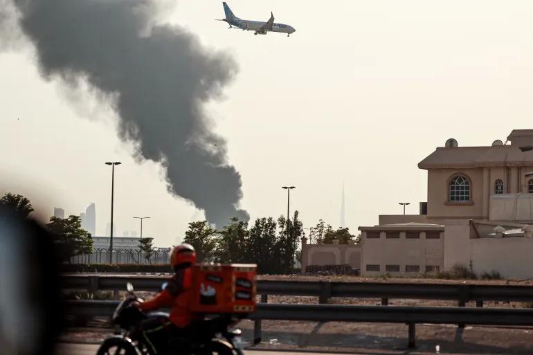 Cột khói bốc lên từ một đám cháy gần sân bay quốc tế Dubai (UAE) ngày 16-3. Ảnh: AFP