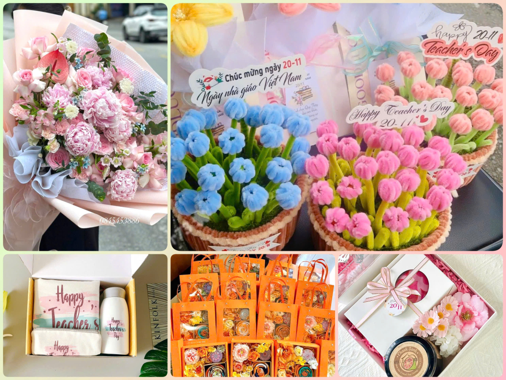 Quà tặng hoa tươi vẫn là lựa chọn phổ biến nhất trong dịp này. Những bó hoa được cắm tỉ mỉ, phối màu tinh tế, kèm tấm thiệp nhỏ ghi lời chúc giản dị luôn mang đến niềm vui cho người nhận. Từ đầu tháng 11, nhiều cửa hàng hoa đã nhận đơn đặt sớm theo chủ đề riêng. Phục vụ nhu cầu tăng cao, các cửa hàng cũng tất bật nhập thêm nhiều loại hoa mới, chuẩn bị sẵn các mẫu cắm tinh tế cho ngày lễ, giá cũng tăng nhẹ so với ngày thường. Hiện giá hoa tươi dao động từ 250.000 - 700.000 đồng/bó hoặc giỏ cắm sẵn. Các món quà lưu niệm tặng cùng hoa như sổ tay, khung ảnh, hay đồ handmade cũng được học sinh, sinh viên lựa chọn vì ý nghĩa và phù hợp túi tiền. Nhiều bạn trẻ còn tự làm thiệp, vẽ tranh, gấp hoa giấy để gửi gắm tình cảm chân thành.