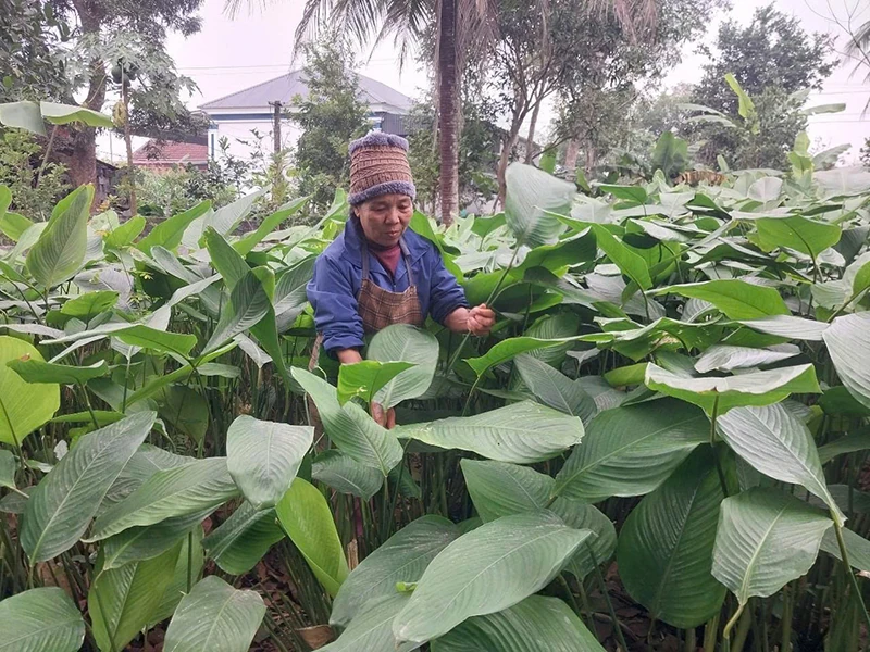 Hơn 20 năm với nghề làm bánh cũng là bấy nhiêu năm, bà Vũ Thị Đào (64 tuổi) trồng cây lá dong trên đất vườn nhà. So với các hộ khác, diện tích trồng lá dong của bà nhiều nhất, với 1.500m2.