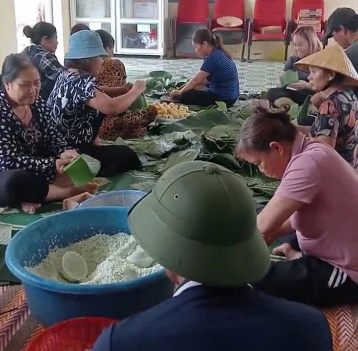 Bà con thôn Vạn Thành, xã Thăng Bình gói bánh chưng gửi bà con vùng bão. Ảnh: Địa phương cung cấp