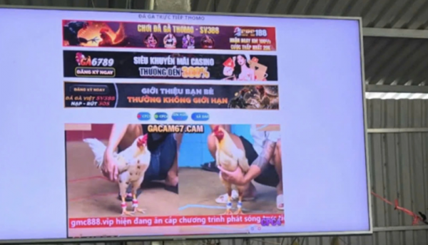 Màn hình chiếu trận đấu đá gà trực tuyến cho con bạc cá cược.